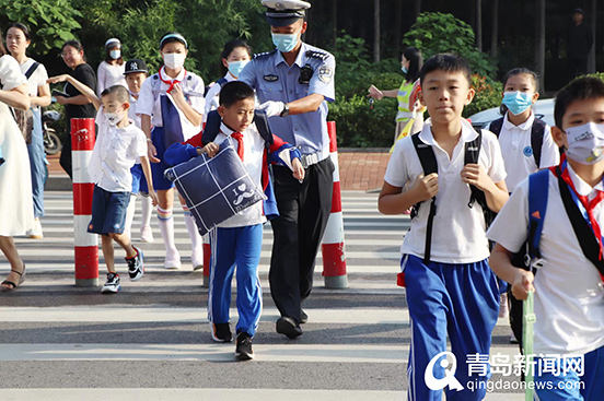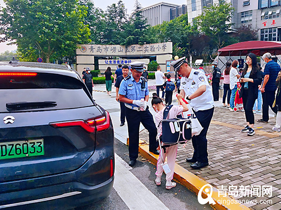 “为了应对开学带来的交通管理压力,我们交警部门提前做足了‘功课’,警校家联合实施交通安全管理等一系列举措缓解因开学带来的交通压力,确保学校周边交通安全、有序和顺畅。”青岛市公安局交警支队相关负责人说。开学第一天,市南交警积极到辖区学校开展“开学第一课”活动。宣讲员通过ppt课件、警示教育视频等形式给师生们带来一堂生动的交通安全教育课。在新学年的起点上,车流量在上班流和上学流的叠加下有所增加,辖区各中队严格按照定人、定岗、定责的勤务机制,严查电动自行车等各类交通违法行为,开启开学第一天的“护学安园”行动。