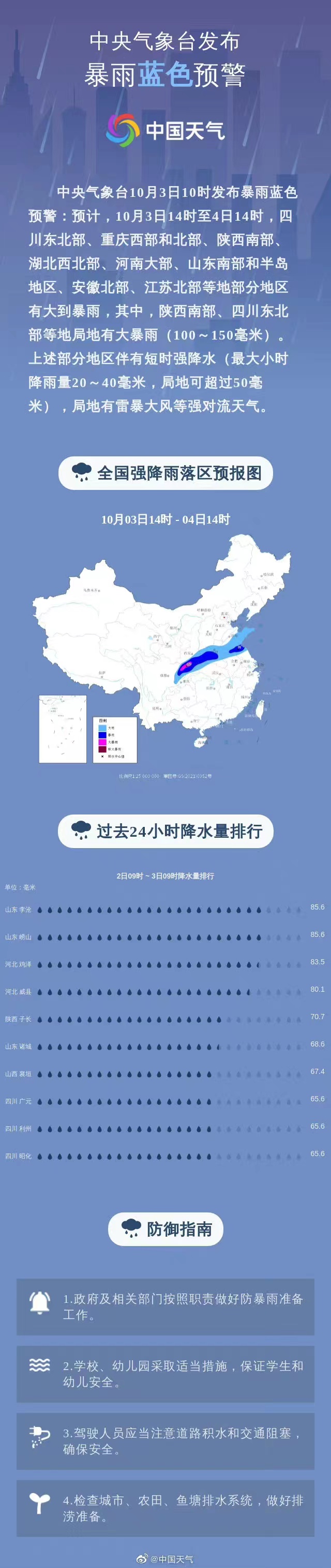 预计,10月3日14时至4日14时,四川东北部、重庆西部和北部、陕西南部、湖北西北部、河南大部、山东南部和半岛地区、安徽北部、江苏北部等地部分地区有大到暴雨,其中,陕西南部、四川东北部等地局地有大暴雨。