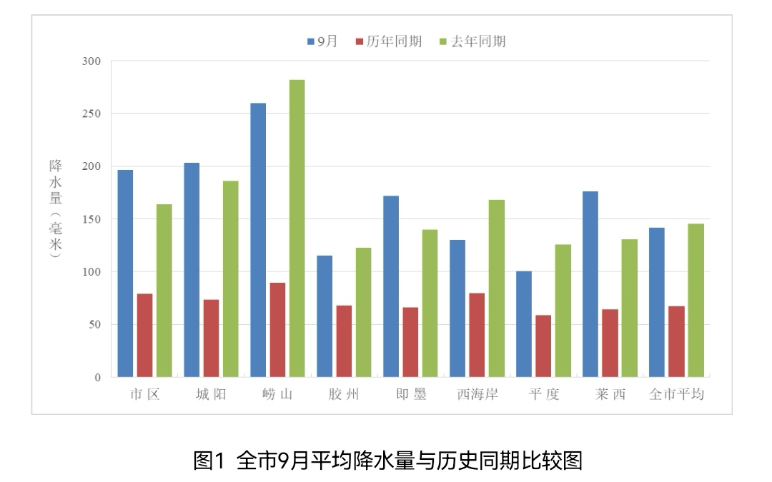 9月份,全市平均降水量142.0毫米,比历年同期偏多74.3毫米(109.7%),比去年同期偏少3.5毫米(2.4%),在1952~2022年共71年水文统计资料系列中,从大到小排第9位,降水偏多。与历年同期相比,各区(市)均偏多,崂山、城阳、莱西、即墨、市区偏多1倍以上,平度、胶州偏多7成以上,西海岸偏多6成以上。