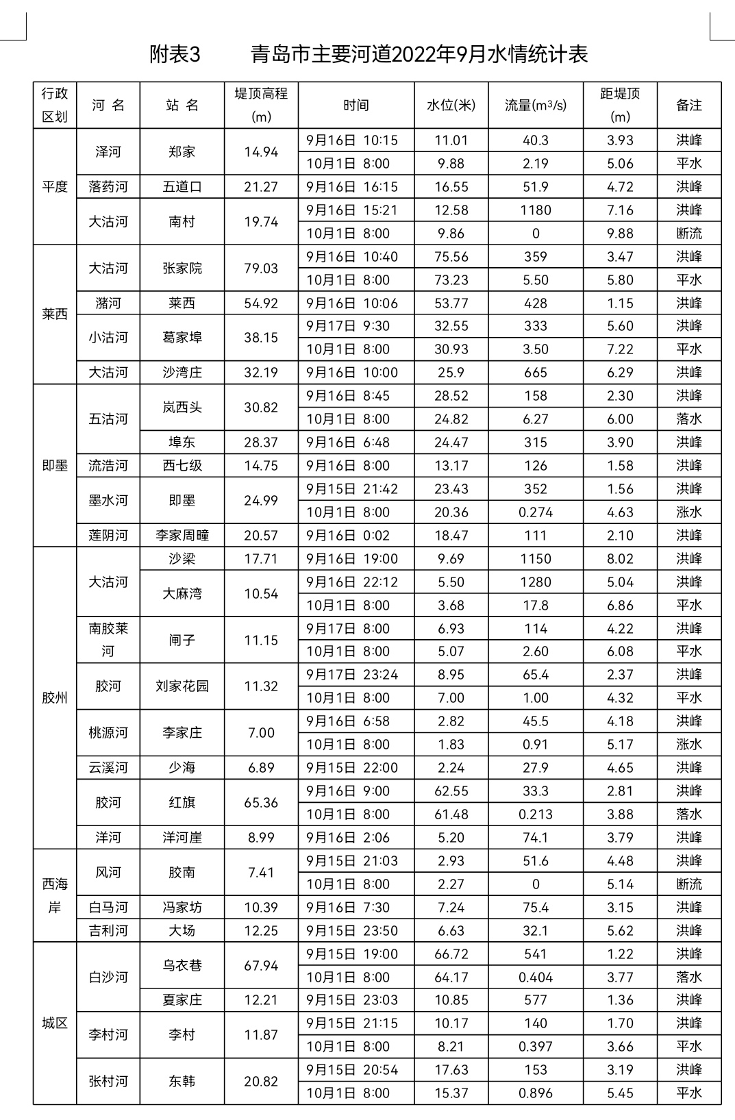 其它主要河道:15日19:00白沙河乌衣巷水文站洪峰流量541(单位:立方米每秒,下同);20:54张村河东韩水文站洪峰流量153;21:15李村河李村水文站洪峰流量140;21:42墨水河即墨水文站洪峰流量352;23:03白沙河夏家庄水文站洪峰流量577;16日00:02莲阴河李家周疃水文站洪峰流量111;06:48五沽河埠东水文站洪峰流量315;08:00流浩河西七级水文站洪峰流量126;08:45五沽河岚西头水文站洪峰流量158;10:06潴河莱西水文站洪峰流量428;22:00小沽河龙虎山水文站洪峰流量176;17日08:00南胶莱河闸子水文站洪峰流量114;09:30小沽河葛家埠水文站洪峰流量333;10月1日8时,大沽河大麻湾水文站流量17.8,其他河道流量均较小或处于河干、断流状态。
