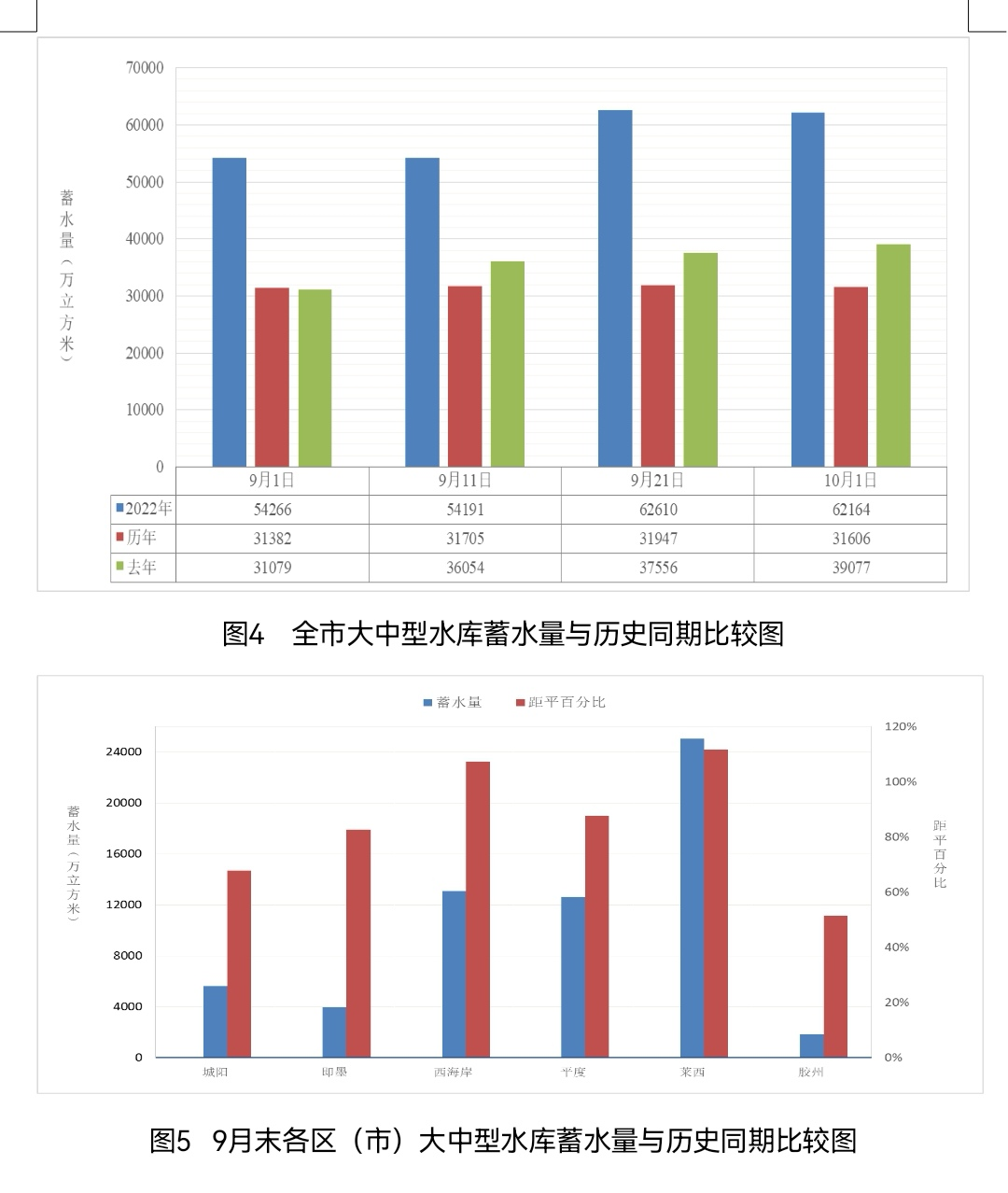 9月末,各区市大中型水库蓄水量较历年同期均偏多,莱西、西海岸、平度、即墨、城阳、胶州分别偏多111.6%、107.1%、87.7%、82.6%、67.8%和51.4%。