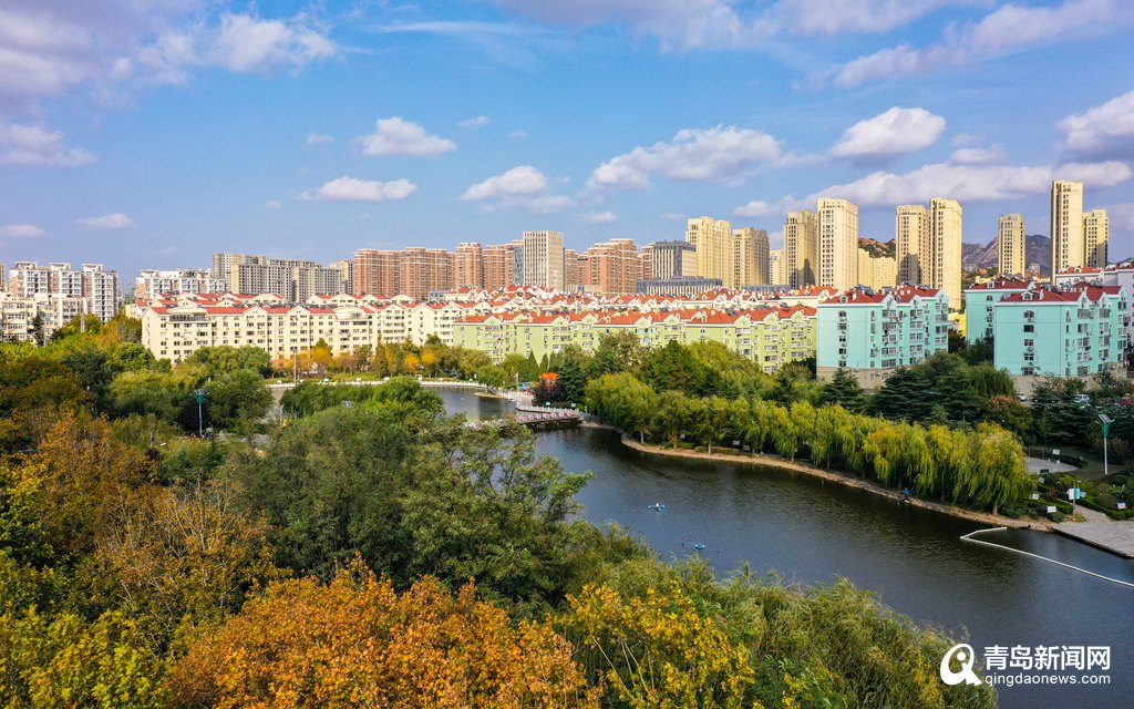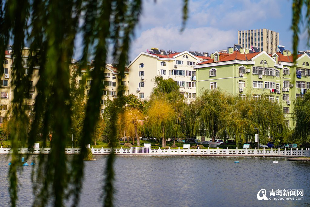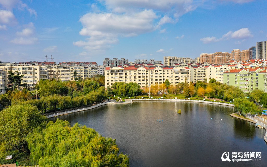 在李沧区沧口街道有一处水域面积约70亩的湖泊,深藏在居民小区之内,这片湖泊便是李沧水上公园。深秋时节,色彩斑斓的树木环绕着一湾碧水,蓝天白云之下,湖泊与周围错落有致的居民楼相映成辉,仿佛一幅精致的秋日画卷展现在眼前,令人陶醉。