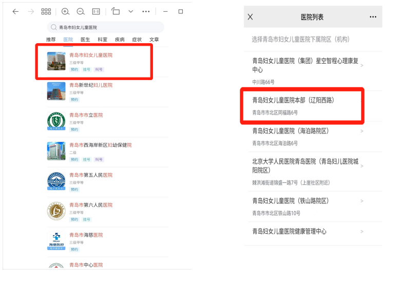2、选择青岛妇女儿童医院——青岛妇女儿童医院本部(辽阳西路)。(同互联网医院门诊就诊攻略)