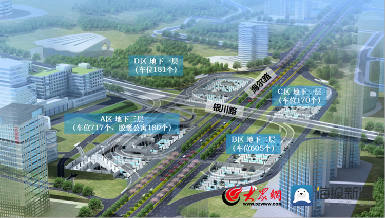 “立交+停车”充分利用基础设施空间,创新开发地下交通“环”。海尔路-银川路立交停车场总建筑面积7.6万平方米,停车泊位1673个,地下停车场可通过“井”字型地下环路快速连通,实现就医车辆“全地下”通行及停放。建成后将形成集地下环路、公共停车、地下人行及公共服务系统一体化的综合交通中心。