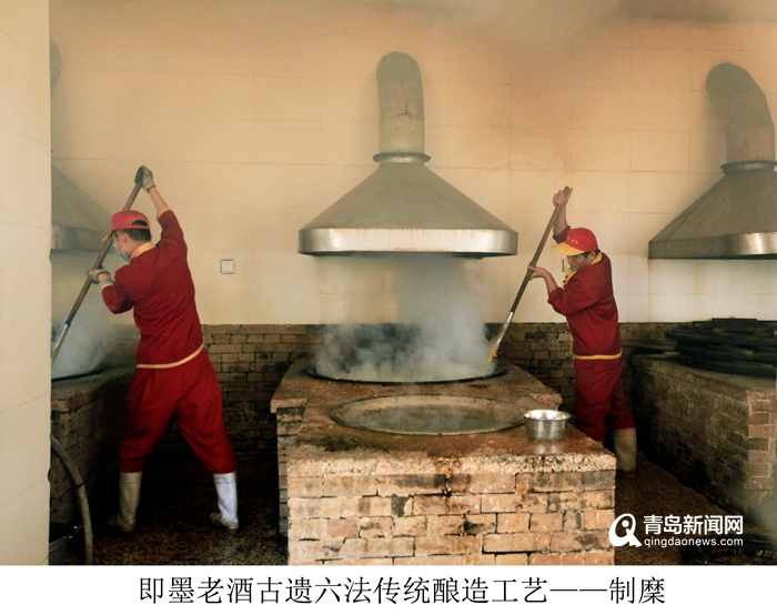 古法酿造工序繁杂,需要时间的沉淀、匠心的打磨、品质的坚守,方得一杯佳酿。时至今日,即墨老酒依旧保持在制酒时独有的煪糜法,煪糜要让大黄米在加热过程中焦而不糊,需要边煮边铲边搅,时刻观察糜的浓稠和色泽变化,因此没有任何的机器设备可以替代,只能人工操作。籍此形成了即墨老酒红褐透明、微苦焦香、后味深长、盈盅不溢的独特风格。