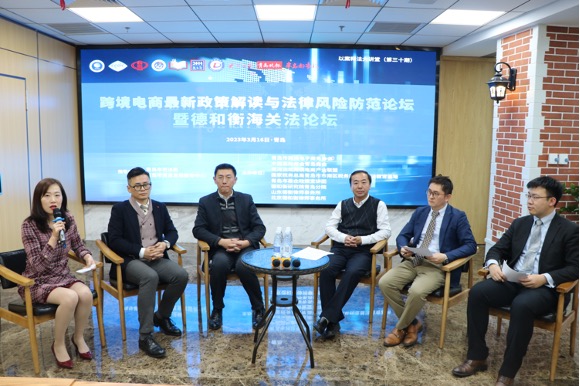 圆桌论坛环节由孙怡律师主持,中国(青岛)跨境电商综合试验区公共服务平台副总经理、青岛市跨境电子商务协会进口分会秘书长张业斌,青岛市跨境电子商务协会常务副会长郑雅乾,黄河流域跨境电商产业联盟秘书长、青岛西海岸新区保税物流中心有限公司总裁办主任刘保军,北京德和衡(济南)律师事务所国际业务部主任岳勃律师,北京德和衡(上海)律师事务所合伙人田江涛律师作为分享嘉宾,以“海关监管的风险防范和合规应对”为主题,结合自身专业领域,就跨境电商的发展形势、行业协会视角下的跨境电商行业、跨境电商海关知识产权保护、跨境电商与财税合规、跨境电商企业与保税物流等方面内容展开了分享和探讨。