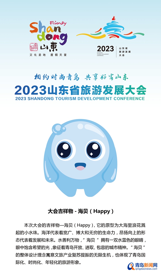 会上还发布了本次省旅发大会的吉祥物——海贝(Happy),它的原型为大海里浪花溅起的小水珠。海洋代表着宽广、博大和无穷的生命力,昂扬向上的形态代表着发展和未来。“海贝”拥有一双水蓝色的眼睛,眼中饱含希望的光,象征着青岛开放、进取、包容的城市精神。“海贝”的整体设计理念寓意文旅产业复苏提振的无限生机,也体现了青岛国际化、时尚化、年轻化的旅游形象。