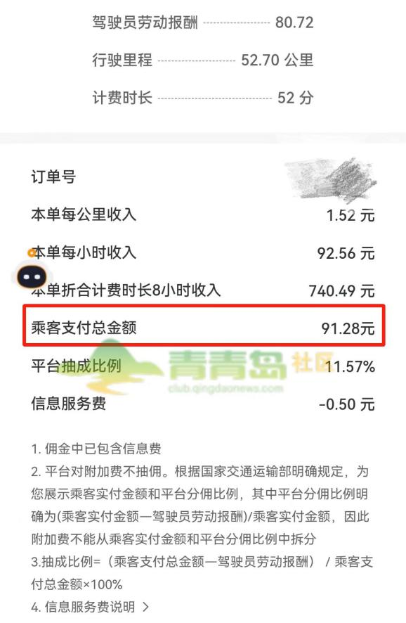 但孙先生看到自己跑的这笔订单显示乘客只支付了91块钱,扣除平台抽成后五十二公里的路程到手只能赚八十块钱,还不包含自己垫付的十块钱高速费。