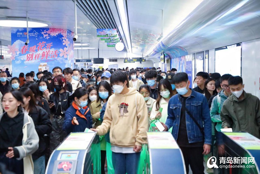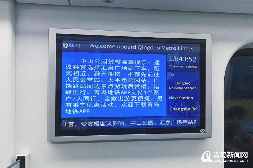 青岛地铁通过调整优化行车组织方案,科学排布不同时段的运力,缩短乘客候车时间(其中3号线周末最小行车间隔为4分35秒);在青岛地铁APP界面上线赏樱弹窗提醒,增加不同时段车站、列车PIS提示,以及不同场景下的列车广播;重点车站出入口通道、扶梯、进出站闸机等区域设置客流保障点位,引导乘客安全、分散出行,保障乘客有序乘车,为乘客提供咨询指引、秩序维护、关爱帮扶等便民服务。