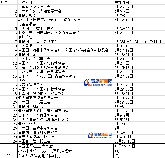 青岛新闻网4月20日讯(记者 朱颖)今天上午,市政府新闻办召开青岛市2023年重点展会、节庆活动安排情况新闻发布会。近期,我市确定了2023年32项重点展会、节庆活动,将搭建起一个个独具特色的高端平台,为加快现代产业体系建设、扩大高水平对外开放、消费升级等带来强劲动力。