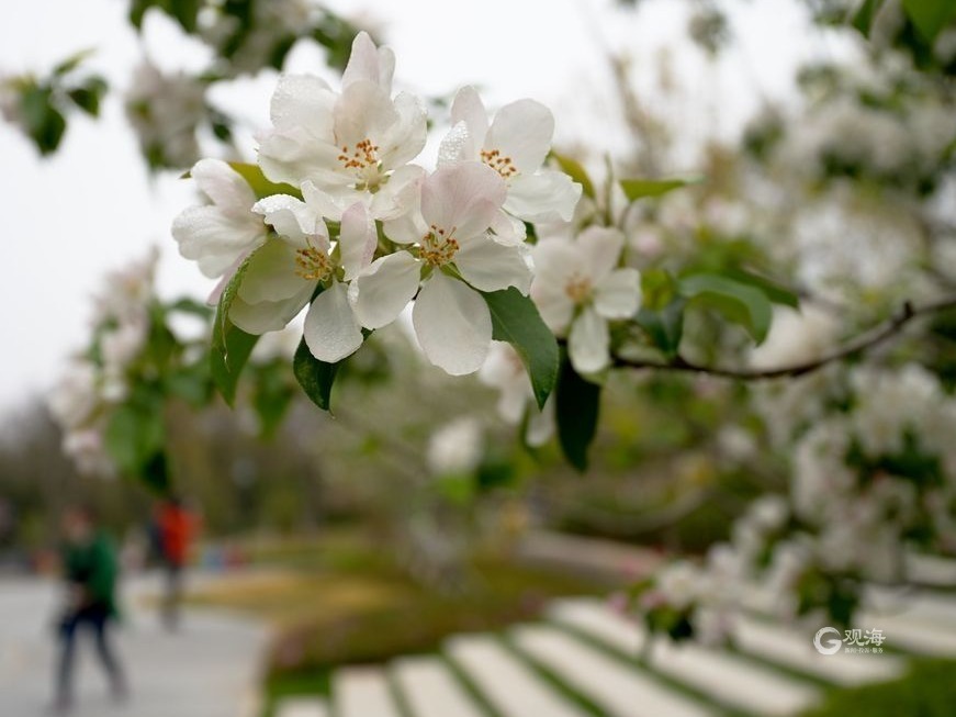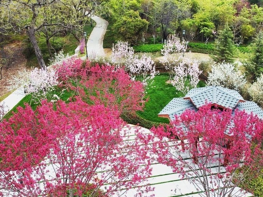 青岛日报社/观海新闻4月21日讯 太平山环山绿道上面积3万多平方米的海棠春樾节点,以“清风绕栾、海棠花开”体现春天的美好,园内种植了垂丝海棠、八棱海棠、冬红海棠等十余个品种。园中建有春樾台,游客在此望山赏花,别具一番春趣。(青岛日报/观海新闻记者 邢志峰 摄)