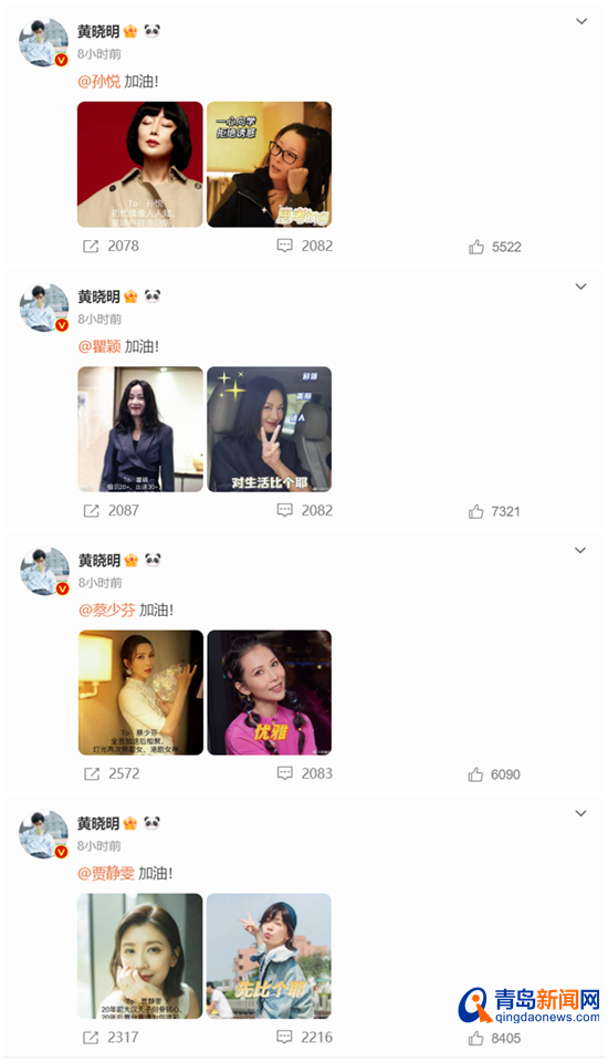 今年与以往不同,黄晓明直接把微博内容简略,文案写在海报上,搭配“加油”二字再发出。有网友统计,发完这33条微博,黄晓明一共用了二十多分钟,确保每一位姐姐都能提到。