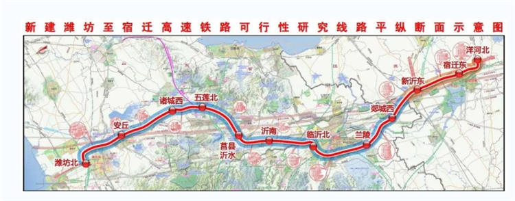 新建潍宿高铁纵贯山东、江苏两省,是国家“八纵八横”高速铁路主通道中京沪通道的重要组成部分,建成后将承担京沪高铁的部分运量,是一条以路网功能为主、兼顾部分城际功能的国家干线铁路。项目起自山东省潍坊市,向南经日照、临沂市,江苏省徐州市,止于江苏省宿迁市,采用时速350公里标准,线路全长399.3公里。其中,山东省境内线路长度325公里。全线设潍坊北、安丘、诸城西、五莲北、莒县沂水、沂南、临沂北、兰陵、郯城西、新沂东、宿迁东、洋河北(越行站)共12个车站。