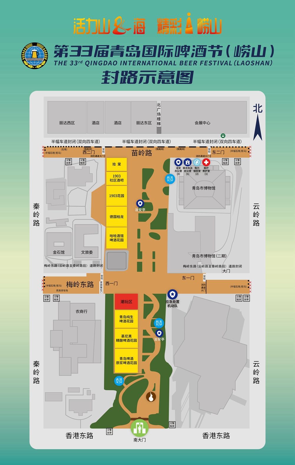 因第33届青岛国际啤酒节举办,崂山会场需占用道路。自2023年7月18日至2023年8月22日苗岭路(云岭路至秦岭路段)南半幅道路实施封闭,由双向八车道改为双向四车道;梅岭东路(云岭路至秦岭路段)实施全程道路封闭。道路封闭期间,封闭区域禁止车辆通行。苗岭路(云岭路至秦岭路段)、梅岭东路 (云岭路至秦岭路段)道路两边停车泊位临时取消。请广大交通参与者提前选择绕路通行。