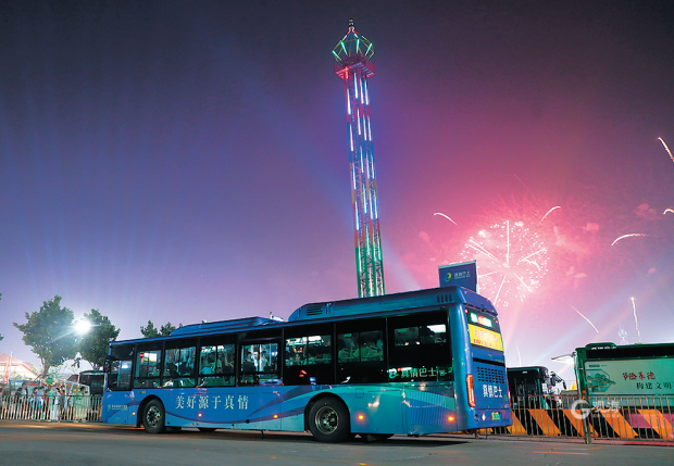 真情巴士啤酒节保障公交车穿梭在夜色中。