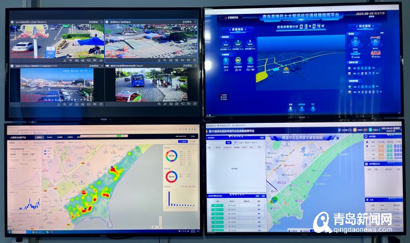 8月2日21点,啤酒城出城游客进入高峰时段。走进金沙滩啤酒城交通保障指挥中心内,记者看到真情巴士大型活动交通保障指挥平台四块大屏幕正在实时更新数据,啤酒城内及周边人员聚集、人员构成、车辆所在位置、道路拥堵等情况清晰可见。一旁,真情巴士集团一名调度员正在根据平台数据监测多条公交线路的发车密度。