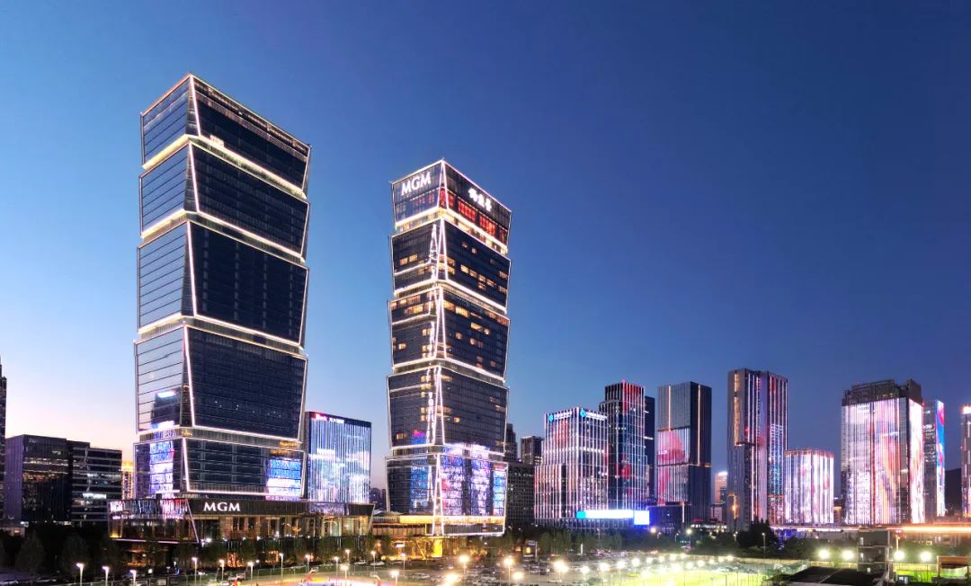 入夜的美高美酒店(左侧高楼)和钓鱼台酒店