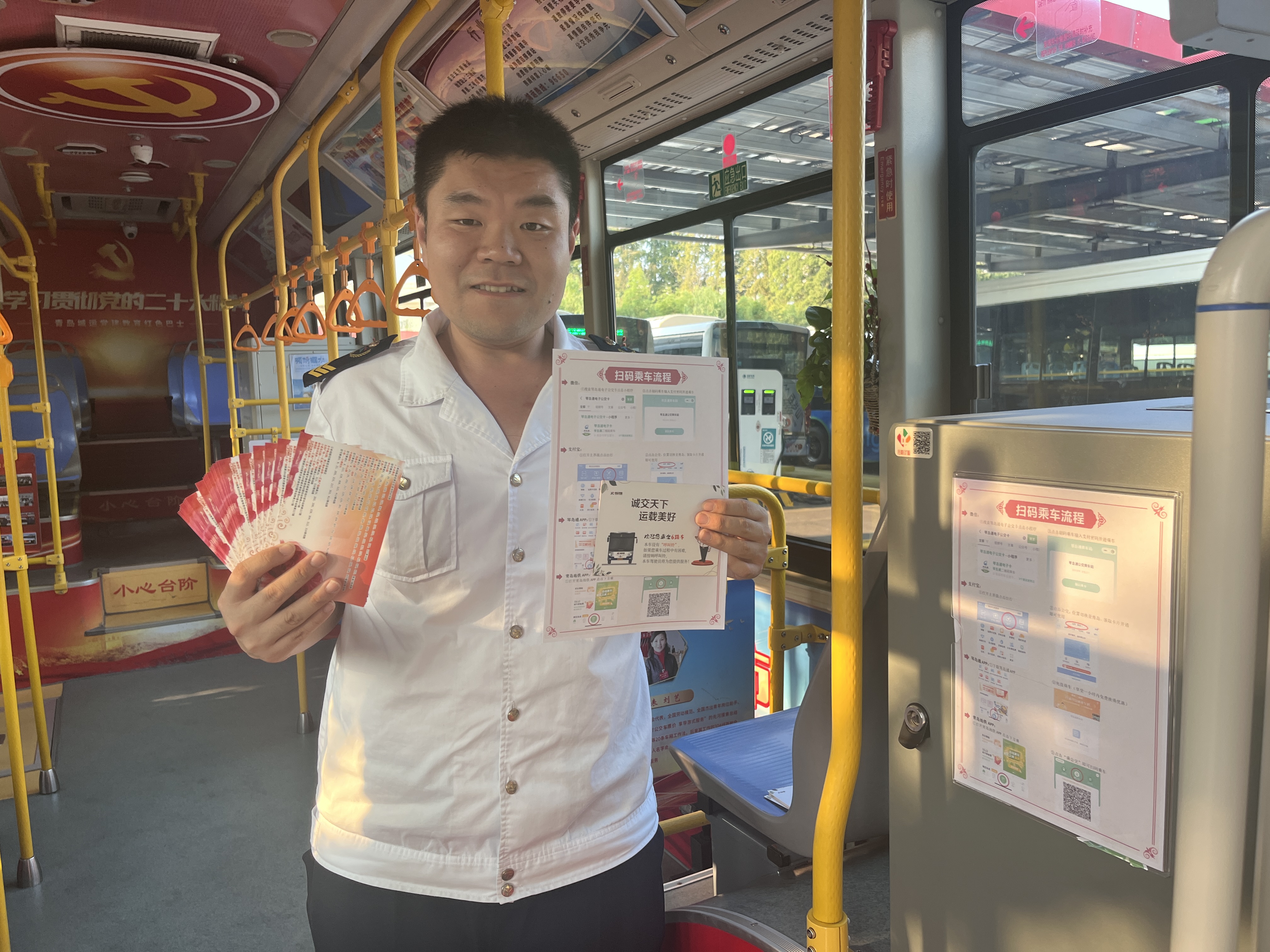近期,青岛迎来旅游高峰,不少外地游客前来感受岛城风光。为了方便外地游客乘车,隧道巴士第六分公司6路线驾驶员周群松设计了公交车换乘信息明信片赠送给乘客,还在公交车内张贴了扫码支付流程、优惠政策信息等,让乘客能够“畅”玩青岛。