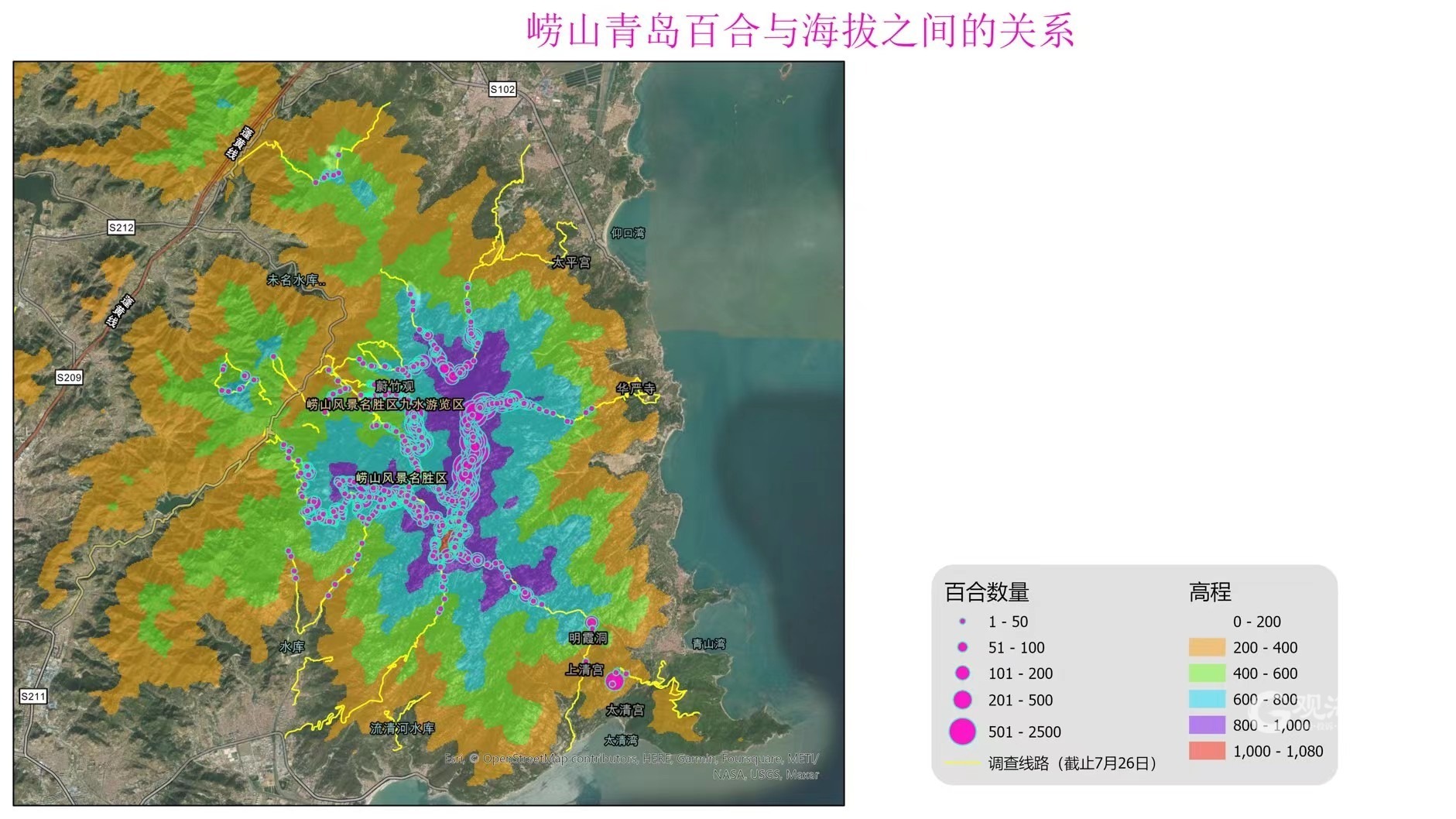 为保护这一珍稀濒危植物,青岛市生态环境局委托青岛农业大学建设了青岛百合养护观测站,成为省级首批生物多样性养护观测站示范试点项目。建设养护观测站是长期定位观测青岛百合生境与生长状态的有效手段,能够第一时间获得青岛百合生境的光照、水文、风力、土壤等方面的数据信息。通过组织收集与青岛百合相关的植物志、科考报告、新闻报道、高清遥感图像、地形图等资料,了解青岛百合可能分布的区域,以及区域内相关调查工作的开展情况,整理调查区内河流、土壤、植被、气候、地形地貌、道路等数据资料,确定了以崂山为重点区域的全域调查计划。