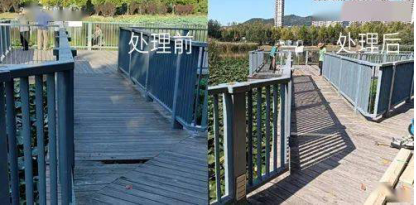 李沧区城市建设管理局工作人员收到报料后,第一时间到达现场勘察情况,组织园林维修工人开展快速、精准的修复工作,并对防护围栏进行加固修缮,确保公园木栈道尽快恢复安全稳固状态。