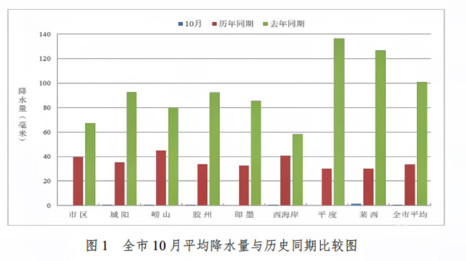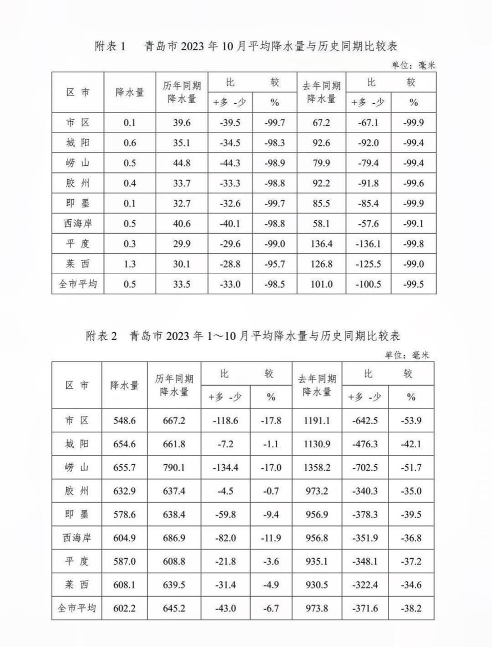 2023年10月,青岛市平均降水量为0.5毫米,为1952年有水文统计资料以来的最小值。与历年同期相比,各区(市)平均降雨量均偏少九成以上。降水主要集中在10月中旬,10月下旬无降水。下旬平度南部及东北部、胶州北部、西海岸新区出现轻度干旱。