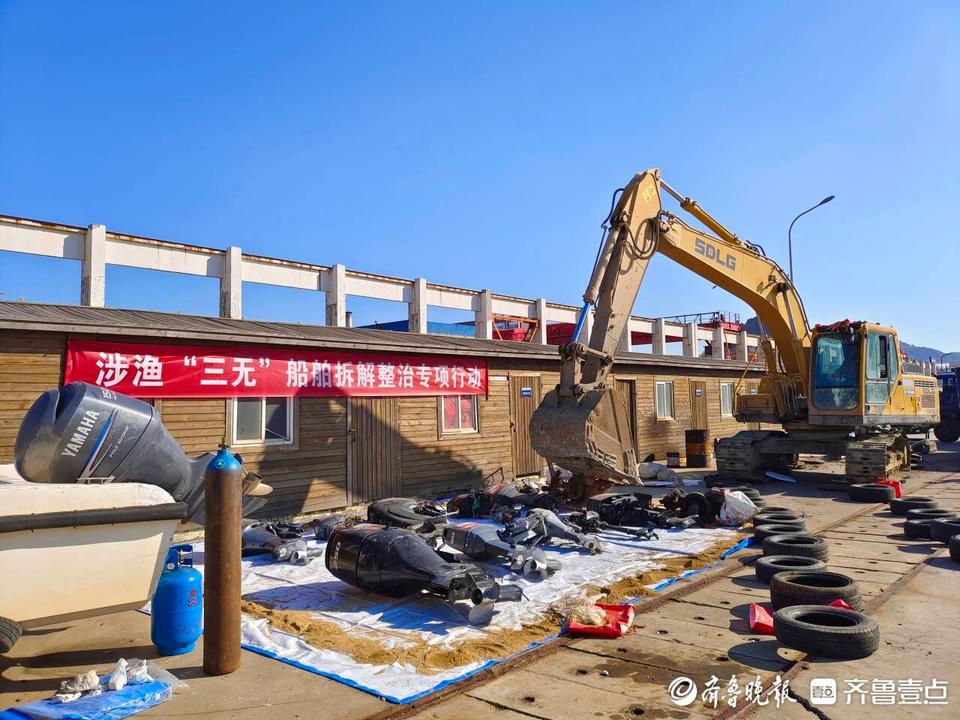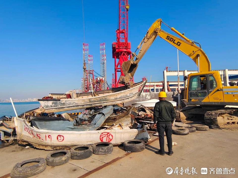 12月2日,青岛市海洋发展局组织开展了涉渔“三无”船舶拆解整治专项行动,对今年3月以来青岛市海洋与渔业行政执法支队查获没收的25艘涉渔“三无”船舶依法进行现场拆解处置,零容忍打击涉渔“三无”船舶。施工现场挖掘机采用“碾压、砸碎”的方式,对码头现场25艘涉渔“三无”渔船进行逐一肢解。同时,为确保全程拆解“不可逆、可追溯”,专门安排执法人员进行全程录像。