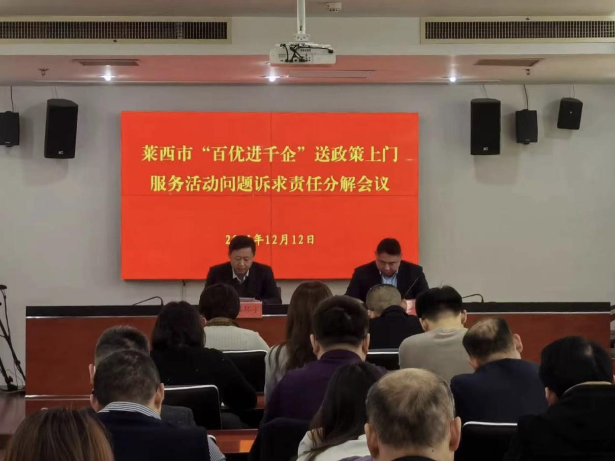 为进一步巩固提升“百优进千企”送政策上门服务活动成果,压实压紧责任,帮助企业纾难解困,不断提升企业获得感和市场主体满意度, 12月1 2日,莱西市召开“百优进千企”送政策上门服务活动问题诉求责任分解会议,向涉企问题诉求发起集中攻坚。莱西市委组织部分管日常工作的副部长、市“深化作风能力优化营商环境”专项行动指挥部办公室常务副主任路环宇,以及各工作专班、各相关镇街和部门分管负责人参加会议。