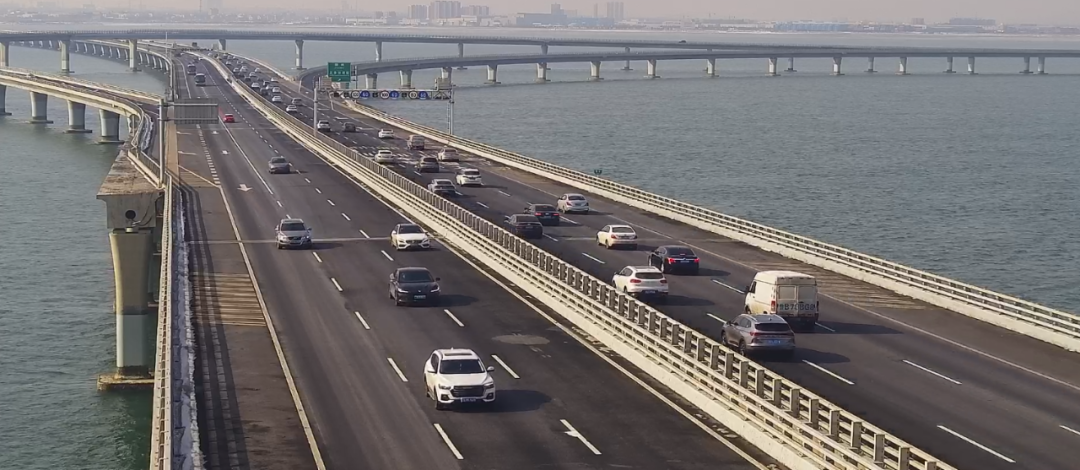 胶州湾大桥上,出青方向车辆明显多于进青方向。