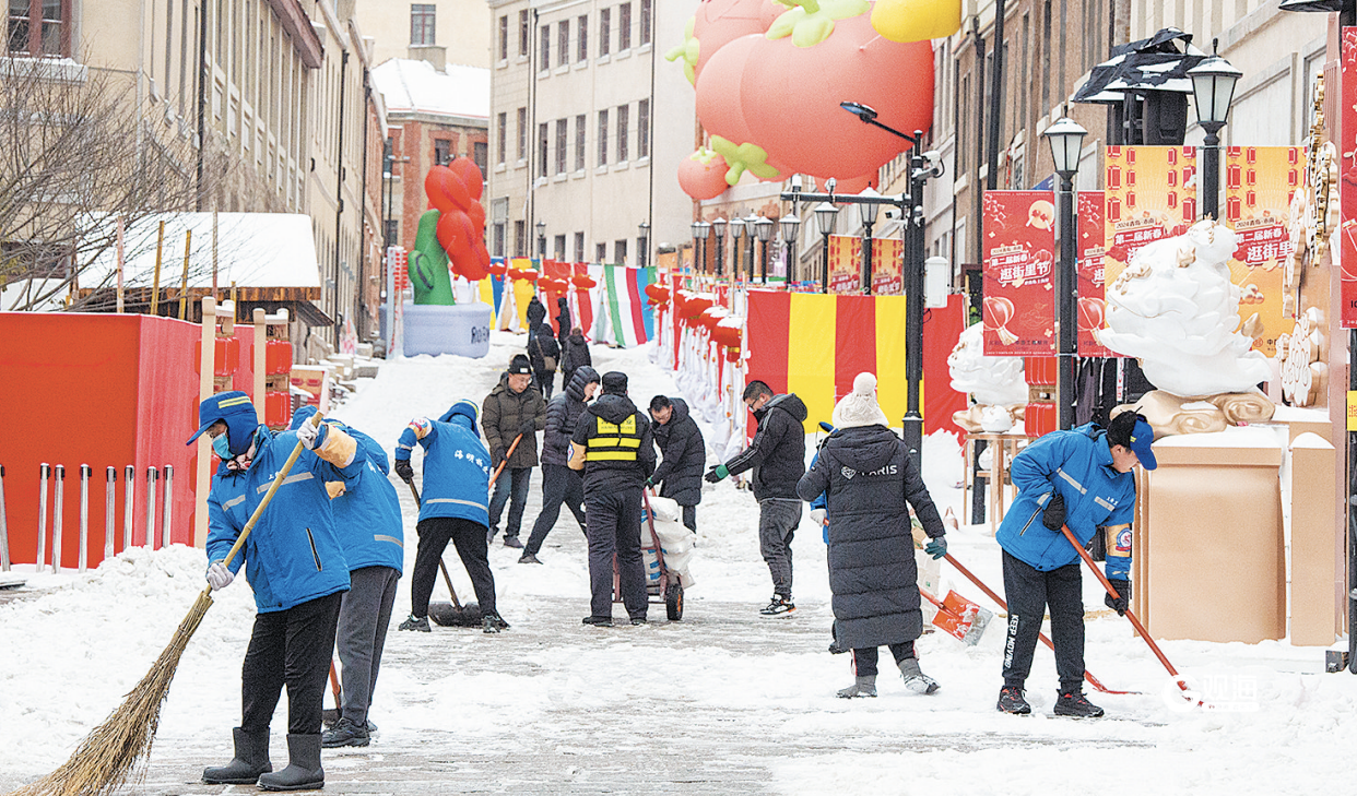 2月20日上午,上街里的保洁人员在黄岛路集体清扫积雪。于滈 摄