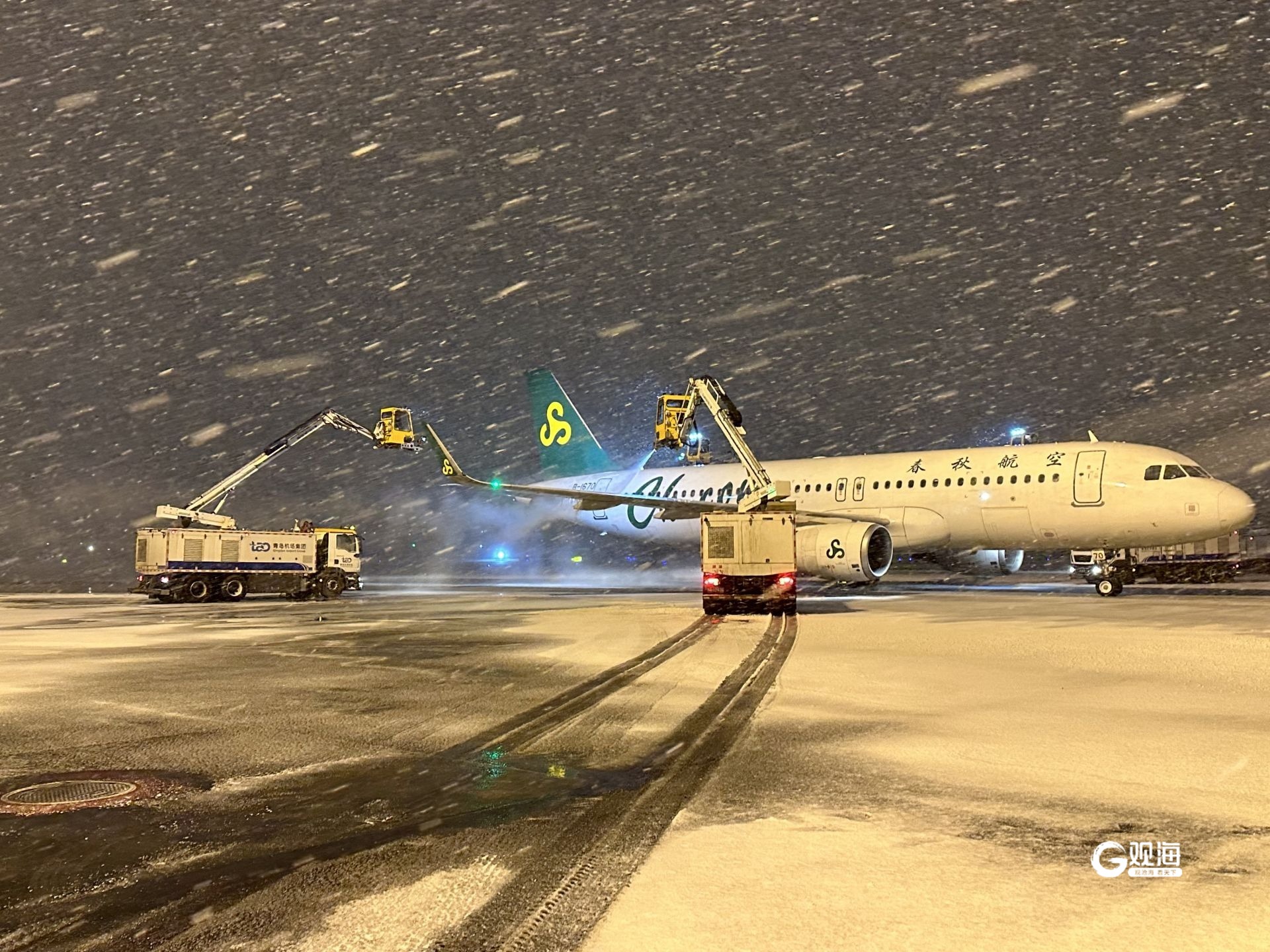 19日21时51分,青岛机场启动除冰雪三级响应,迅速开展飞机除冰作业,清除机坪跑道冰雪,组织突击队全力清扫旅客进出机场的道路。同时,科学部署、精准计算提升降雪天气下航班的正常率与靠桥率,确保进出港航班平稳起降。