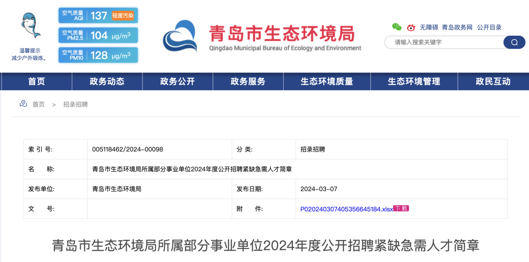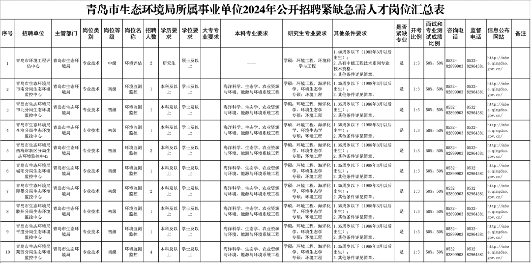 青岛市生态环境局所属10家事业单位计划招聘共计16人。