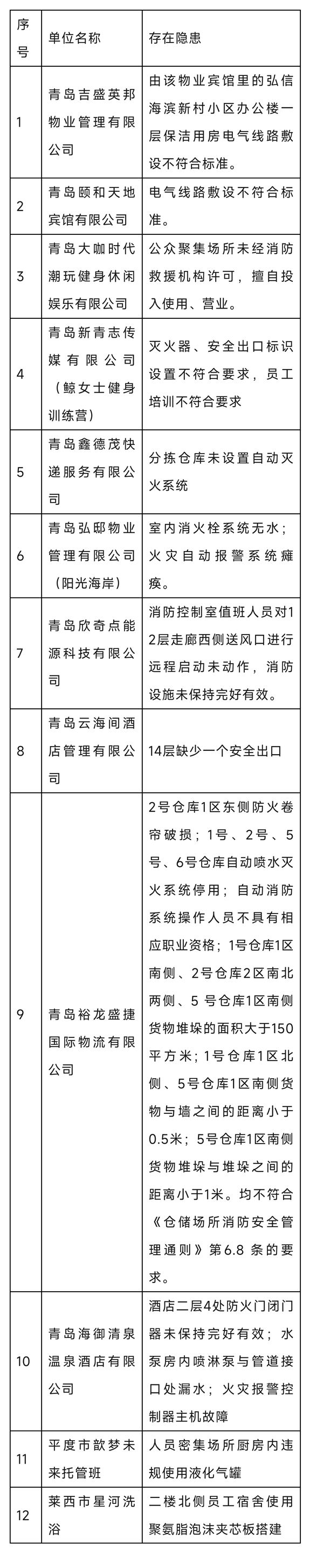 青岛新闻网3月14日讯(记者 陈志伟)近期,青岛市消防救援支队全面排查“九小场所”、多业态混合生产经营场所、人员密集场所及其他重点场所存在的突出风险隐患,现对检查中发现存在火灾隐患的12家单位进行集中曝光,以督促相关单位落实消防安全主体责任,及时整改消除隐患。
