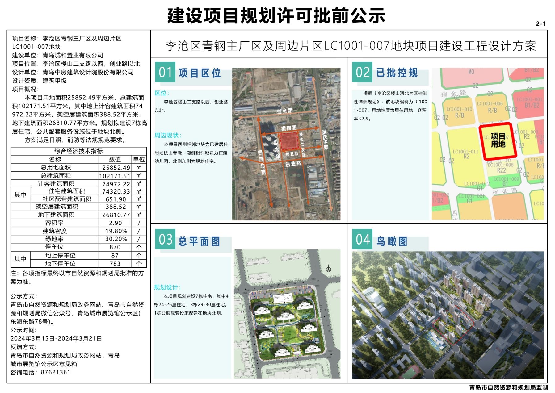 青岛日报社/观海新闻3月17日讯 近日,青岛市自然资源和规划局发布了《李沧区青钢主厂区及周边片区LC1001-007地块建设工程设计方案批前公示》,项目位于李沧区楼山二支路以西,创业路以北,由青岛城和置业有限公司负责建设。
