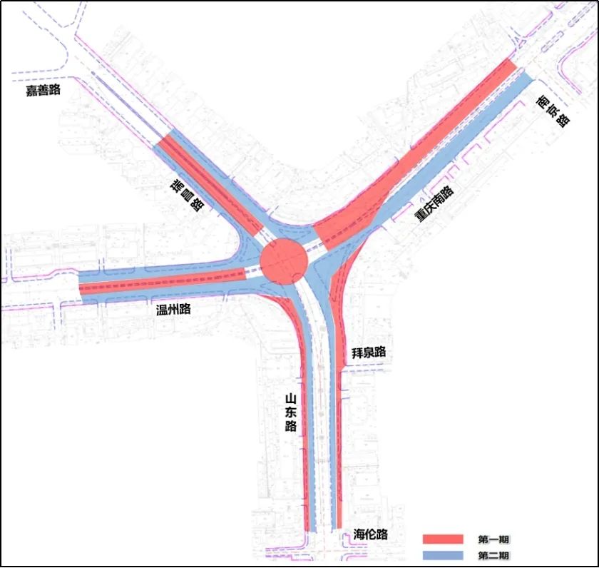 因重庆南路山东路路口区域道路施工,自3月22日起至7月30日进行分阶段交通调流。