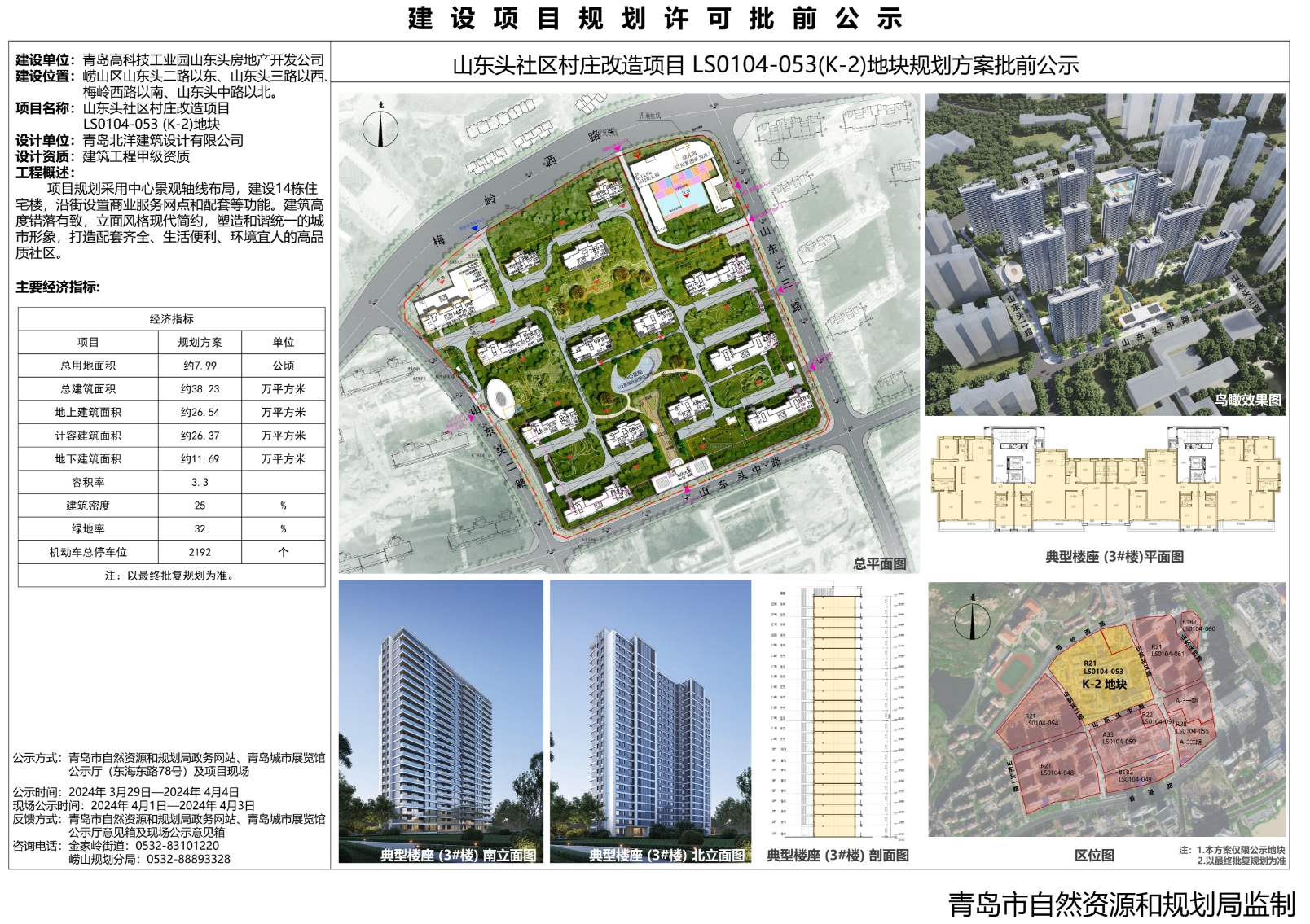 3月29日,青岛市自然资源和规划局发布《山东头社区村庄改造项目LS0104-053(K-2)地块规划及建筑方案批前公示》。方案显示,崂山区山东头二路以东、山东头三路以西、梅岭西路以南、山东头中路以北。由青岛高科技工业园山东头房地产开发公司负责建设。