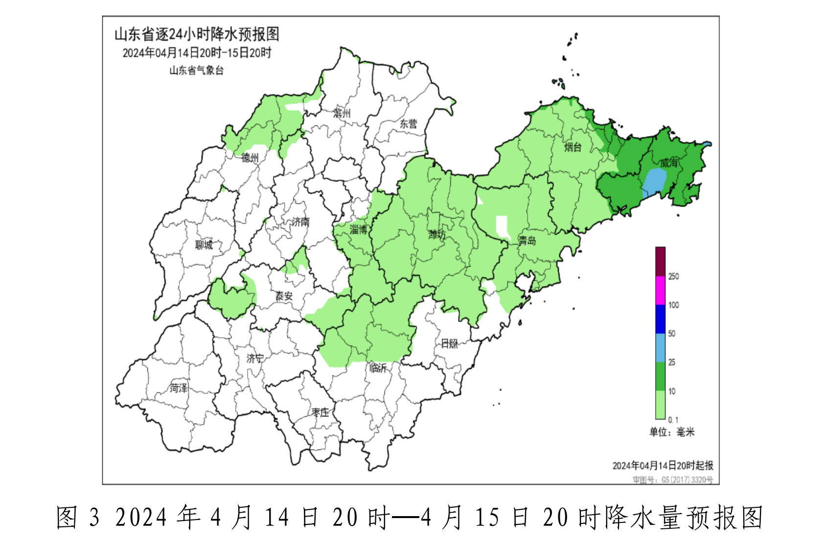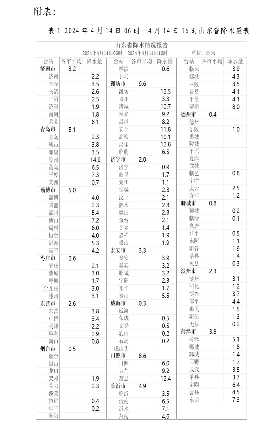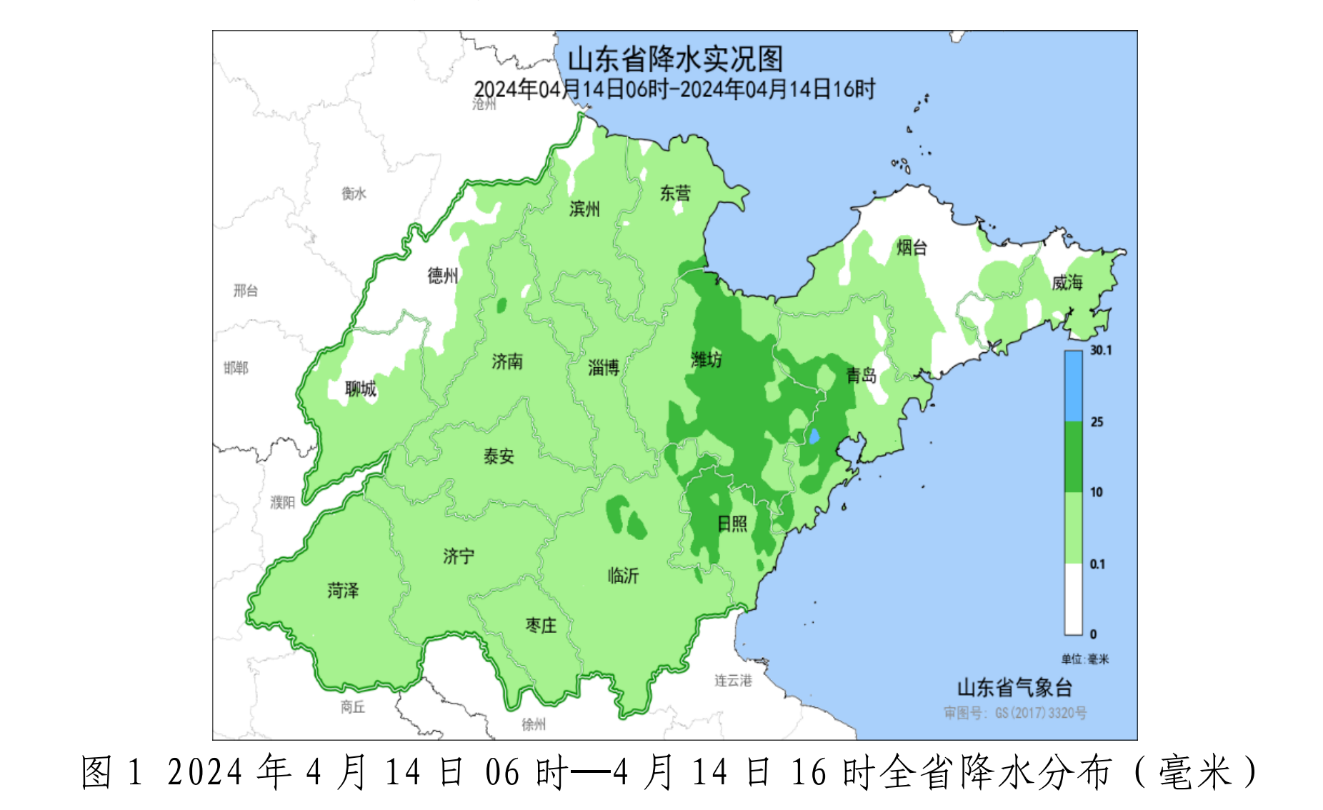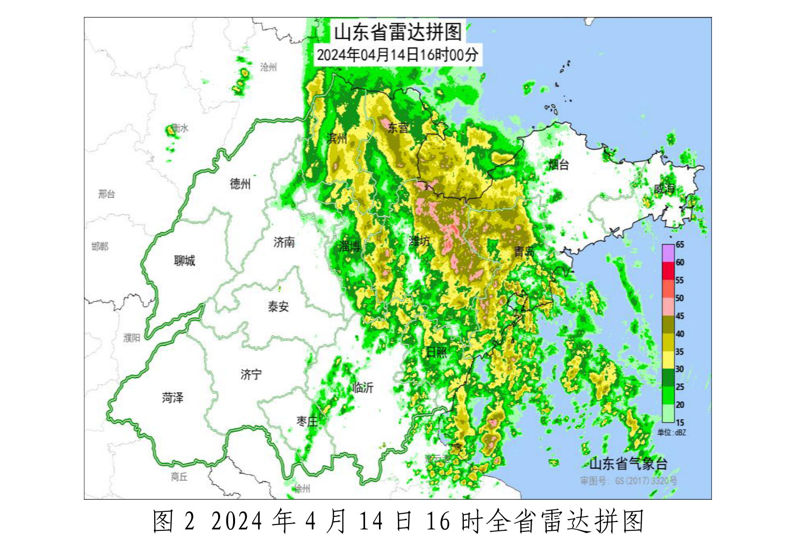 4月14日06时至16时,全省共有16市107县(区市)、1575乡镇出现降水(图1),平均降水量3.5(毫米,下同),折合水量约5.4亿方。各市平均:潍坊9.6、日照8.6、青岛5.1、淄博5.0、临沂4.9、菏泽 3.8、泰安3.3、济南3.2、枣庄2.6、东营2.6、滨州2.3和济宁2.0,其他市不足1.0。县(区市)平均降水量超过10.0的7个,5.0—10.0的19个,1.0—5.0的65个,前3位的是:青岛胶州14.9、潍坊昌乐12.8和潍坊市区12.5。目前,降水回波主要位于淄博、潍坊、烟台、日照、东营、青岛、滨州(图 2)。