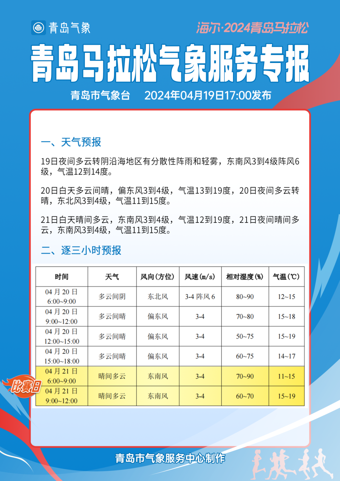 从4月13日起,青岛市气象部门为青岛马拉松提供递进式、精细化气象服务专项预报。比赛当天,气象保障人员将现场观测、采集比赛场地气象数据并实时发布,为青岛马拉松赛事的顺利开展提供细致、周到、智慧气象服务。
