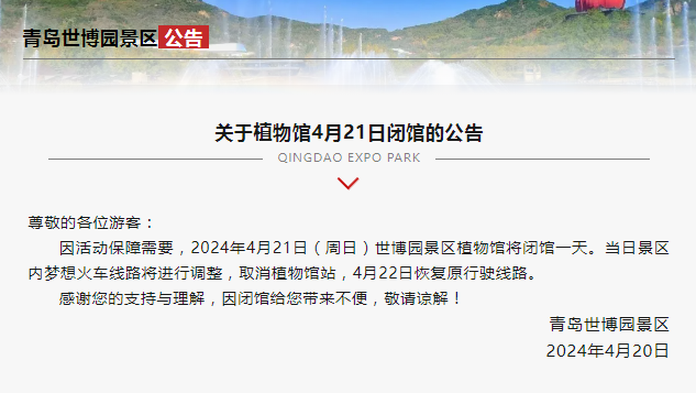 因活动保障需要,2024年4月21日(周日)世博园景区植物馆将闭馆一天。当日景区内梦想火车线路将进行调整,取消植物馆站,4月22日恢复原行驶线路。