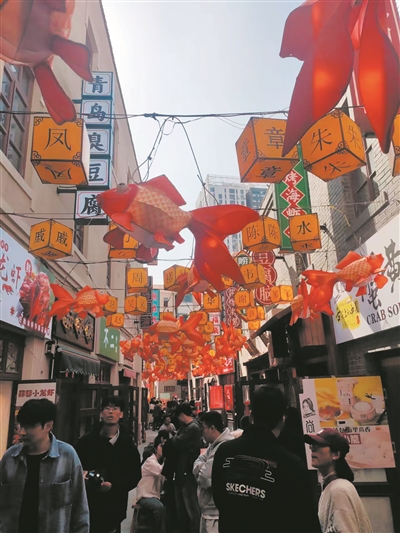 在大鲍岛文化休闲街区,海泊路上的“大焕异彩步步生花”非遗剪纸系列美陈、“千灯映鲍岛”灯笼氛围已经就位。“目前,街区南片整体氛围营造已经初现成效,我们将加大力气丰富北片展陈。比如,联合街区店铺布置国潮风系列的灯箱侧招,在即墨路重要节点设置青年新潮主题的网红打卡美陈,并利用暂未落位业态的院落打造‘植物想象力’等主题展陈,提升历史城区人气和商气。”张洋介绍。