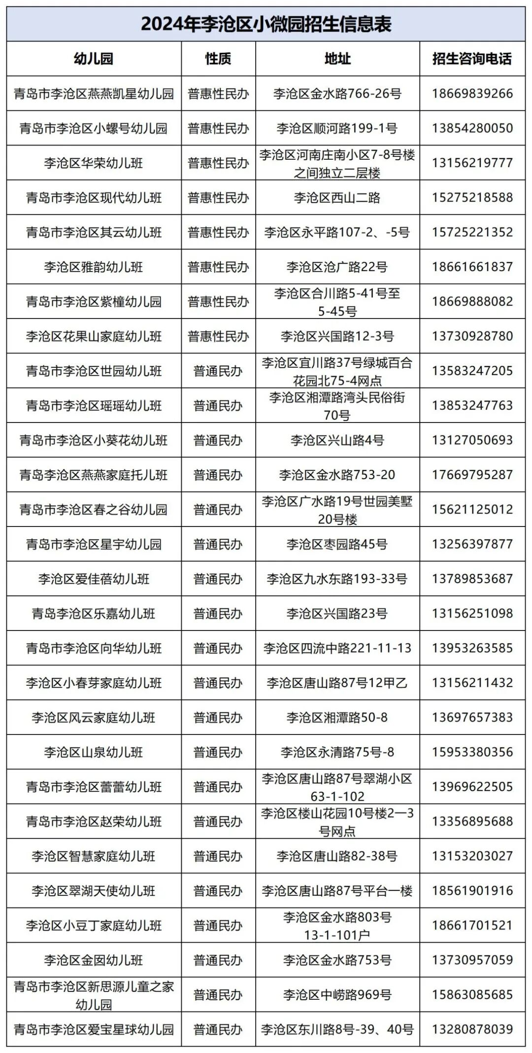2024年5月10日(星期五),通过微信公众号“李沧教育”,向社会发布《2024年李沧区幼儿园招生工作方案》《2024年李沧区幼儿园招生信息表》《2024年李沧区小微园招生信息表》。同时,各幼儿园通过幼儿园微信公众号、在幼儿园大门口或宣传栏张贴等途径,发布本幼儿园招生简章。