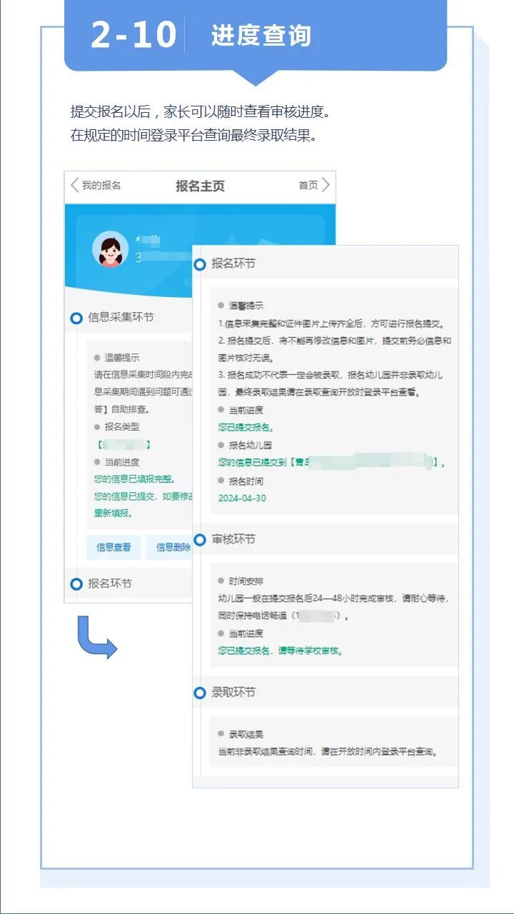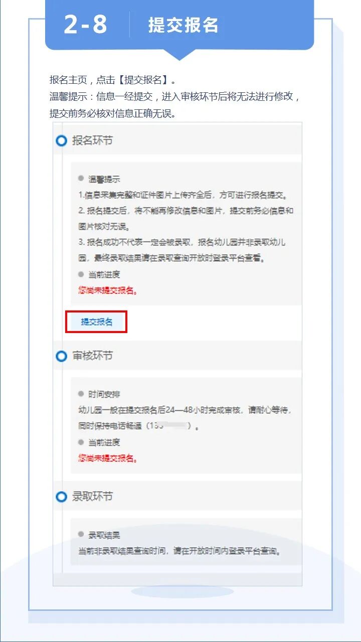 第二次招生。6月17日(星期一)有空余学位的幼儿园发布二次招生信息,并于6月18日(星期二)至6月20日(星期四)再次开放报名服务平台,未被录取的幼儿进行二次报名,6月21日(星期五)公布录取结果,家长可以通过报名服务平台查询录取情况。