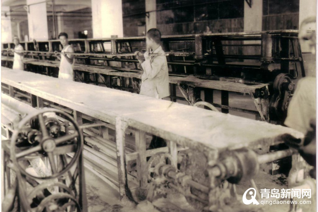 解放前,青岛橡胶厂内胎硫化车间工作场景。