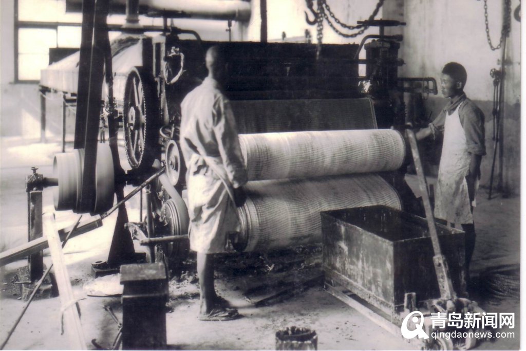 解放前,青岛橡胶厂胶管成型车间工作场景。