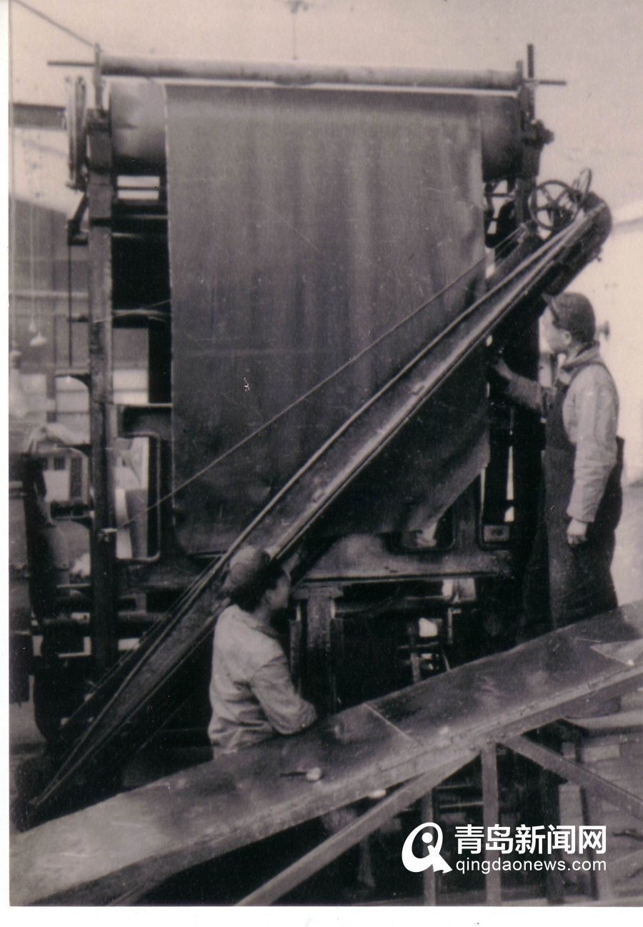 新中国成立初期,青岛橡胶厂的立式裁断机。