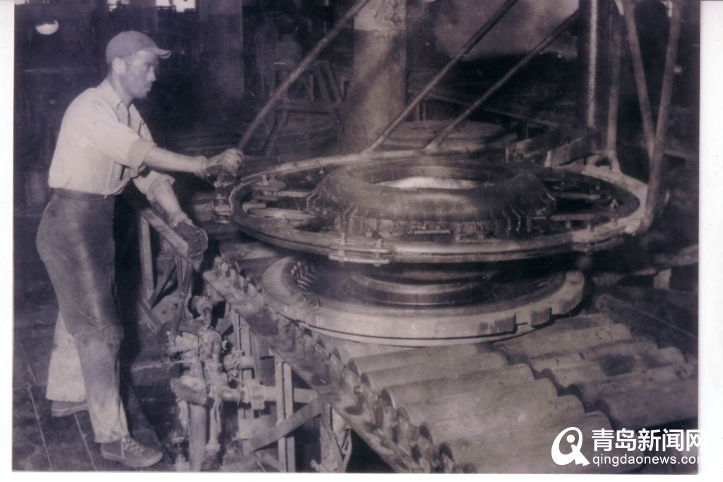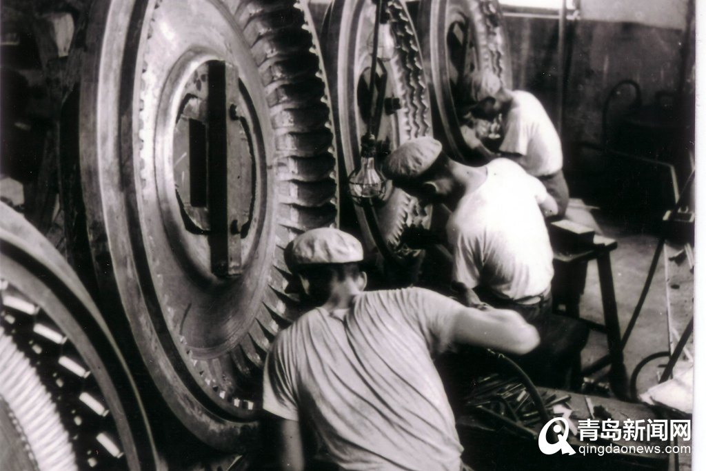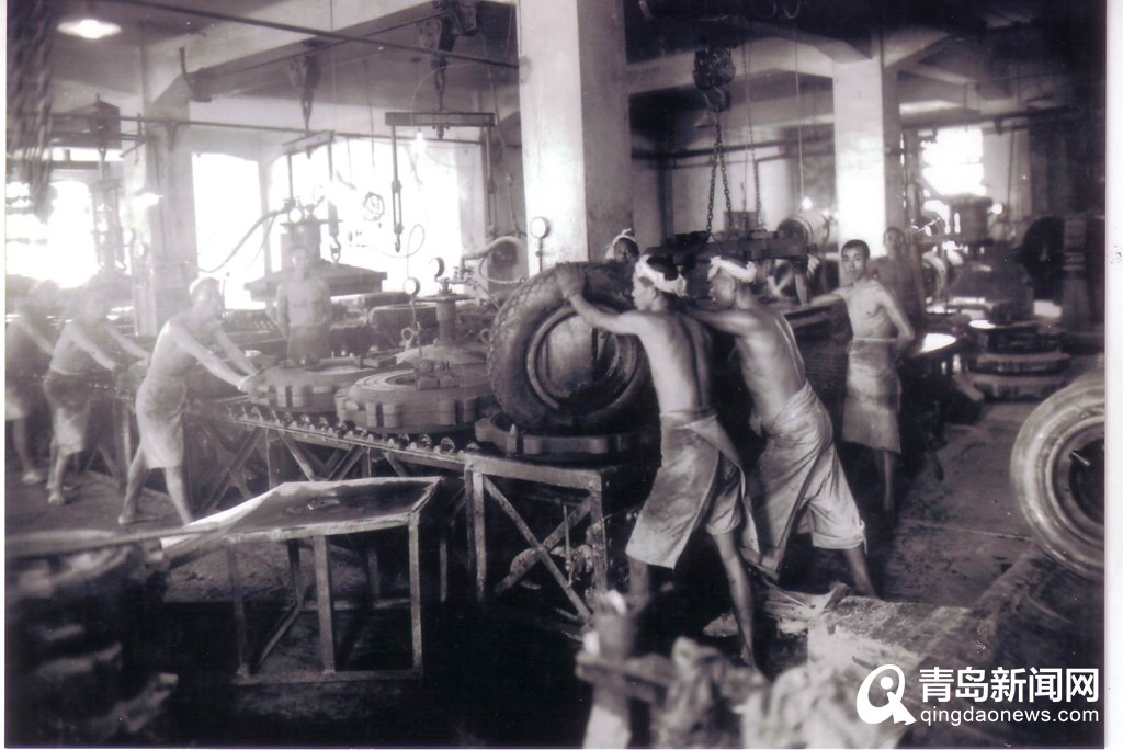 解放前,青岛橡胶厂BS制胎场轮胎硫化车间工作场景。