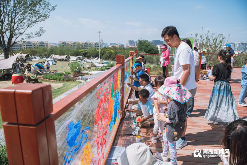 稚嫩的面庞上神采奕奕,天马行空的想法在笔下落地生根,五颜六色的颜料在阳光下闪闪发光,孩子们在玻璃栈道上进行彩绘创作,栈道新添的生动色彩,与身后的青绿浮山、水蓝天色交相辉映。“喜·乐”身体打击乐坊中,家长们和孩子们一起在舞台上跟随音乐律动,笑声与音乐交织在一起,感受身体的律动和节奏的魅力,气氛欢乐而温馨。“幸福天门”端午欢歌将整个现场气氛推向高潮,在大家的热烈要求下,舞龙和竹竿舞不断临时加演,舞龙盘旋飞舞,竹竿舞灵动欢快,孩子们在竹竿之间轻盈跳跃,欢声笑语洋溢在浮山脚下,定格为山海之城艺术季活动中的一道靓丽风景。