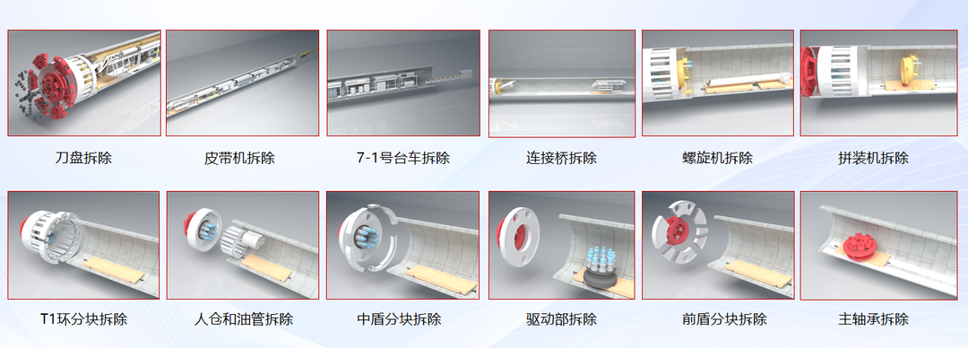过程听起来简单,实际上却涉及刀盘、前盾、中盾、驱动、管片拼装机、螺旋输送机等上千个零部件。所有的拆解工作都需要在盾壳内进行,既要保护各部件不受损坏,又要在40天之内完成,且拆解后的最大部件重量达55吨,厚度达1.2米,半径有1.7米,在半径仅为2.75米的隧道内完成翻转和运输,还要保护成品隧道不受伤害,犹如抽丝剥茧。