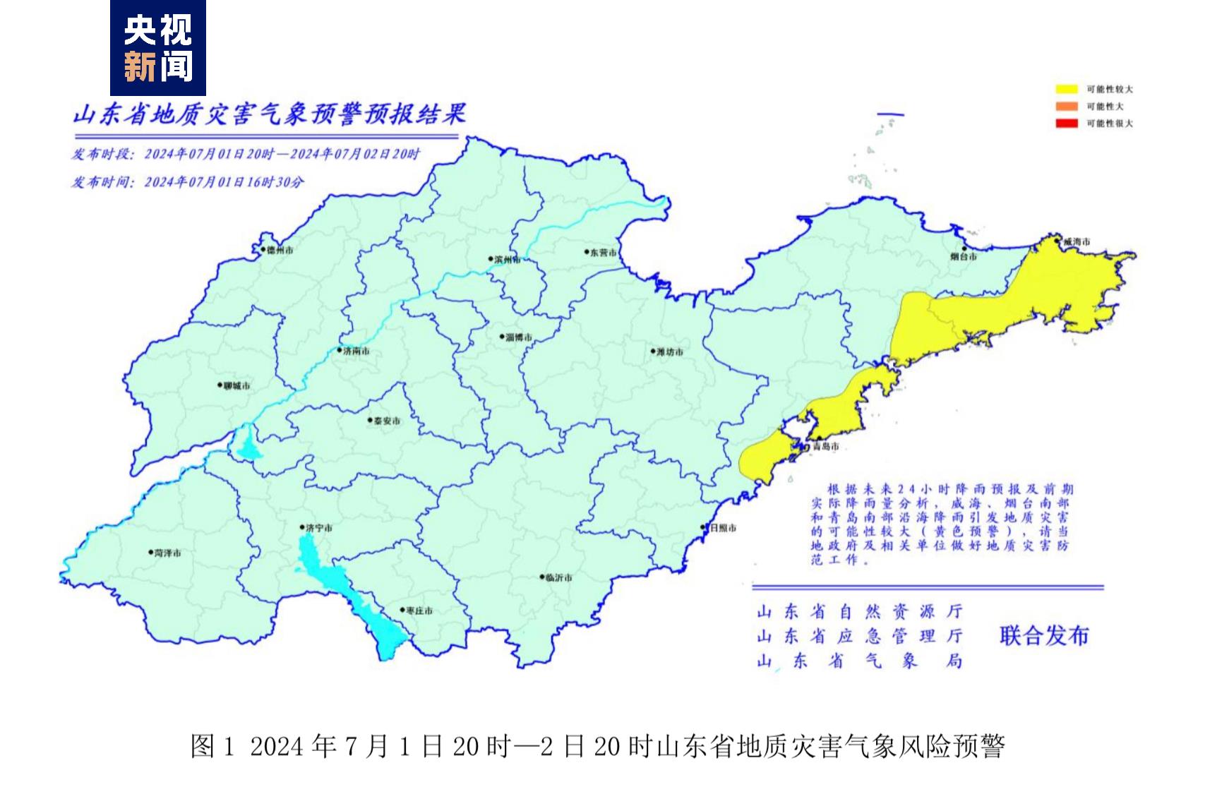 与此同时,山东省水利厅和山东省气象局联合发布的山洪灾害气象预警显示:7月1日20时至7月2日20时,青岛、烟台、威海等市局部地区可能发生山洪灾害(蓝色预警)。