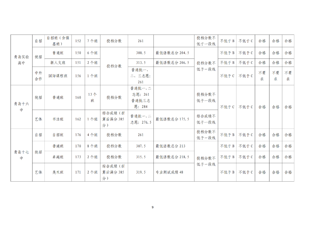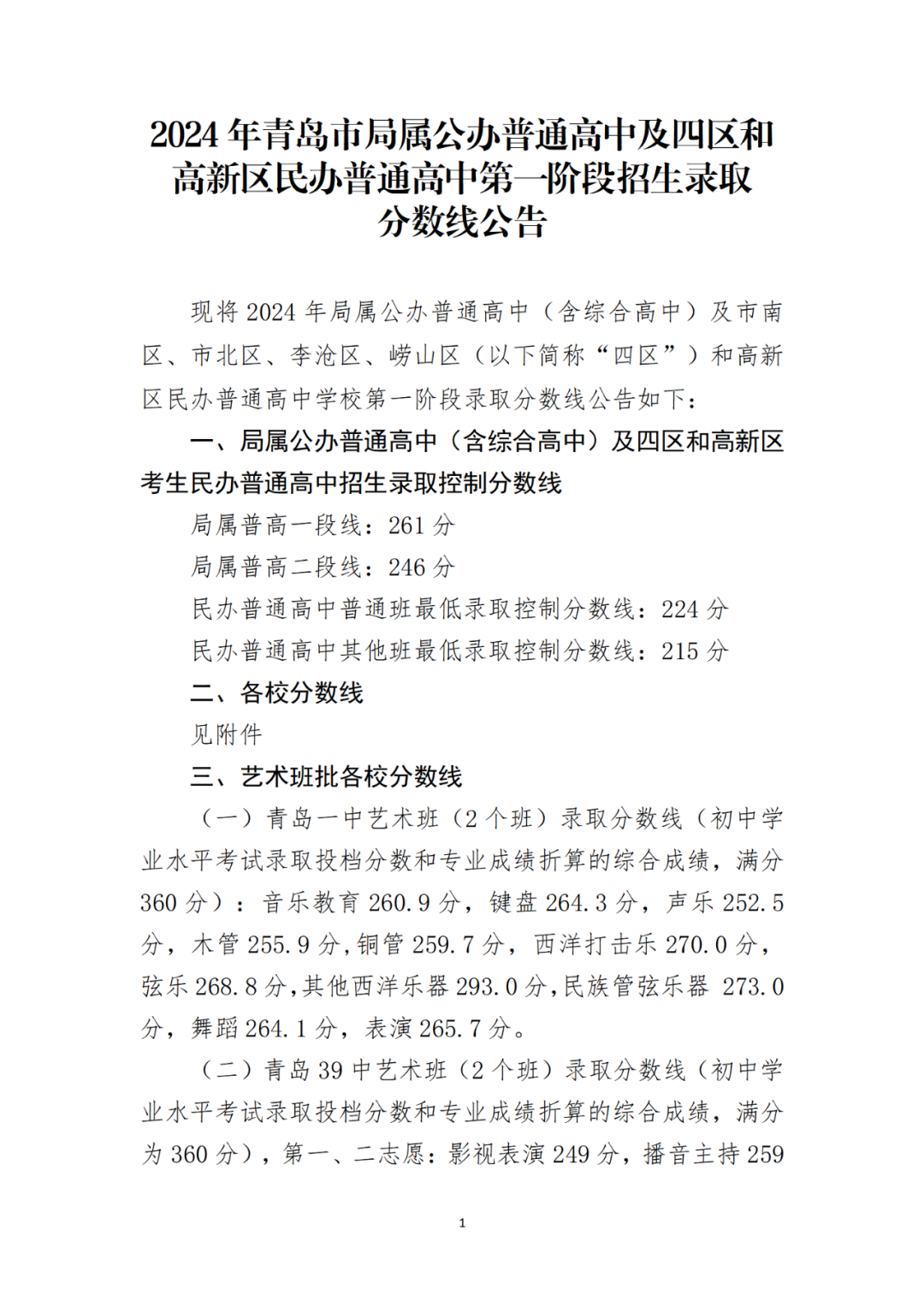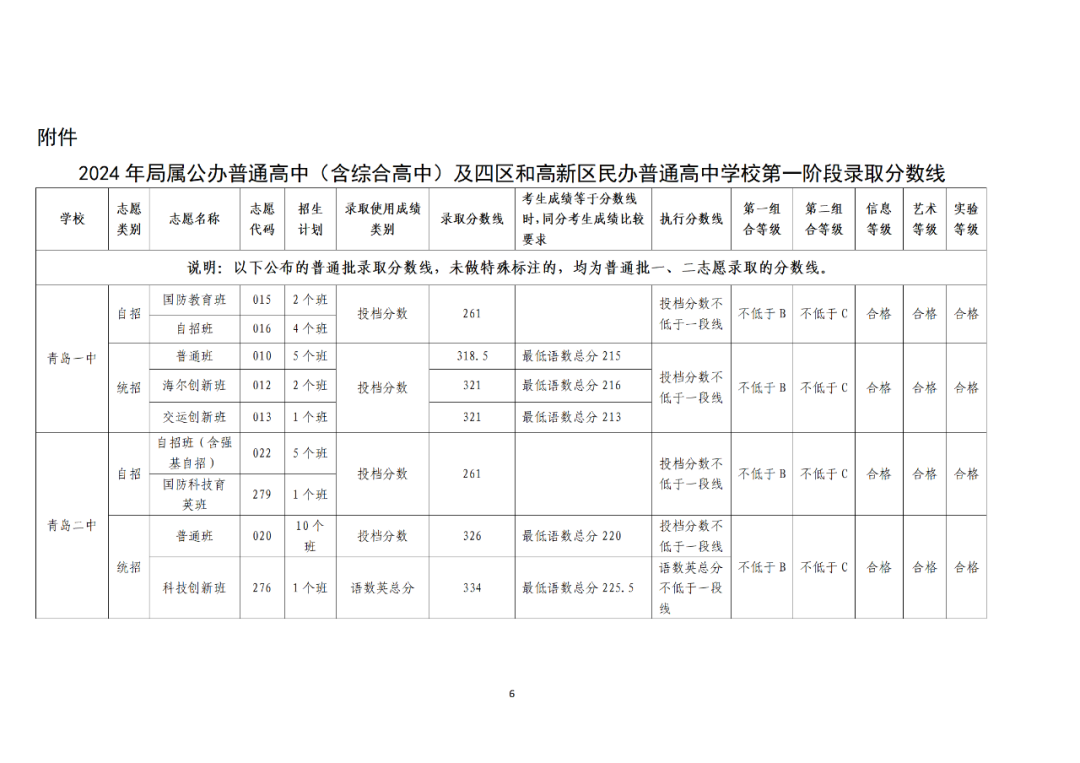 2024年青岛市局属公办普通高中及四区和高新区民办普通高中第一阶段招生录取分数线公告