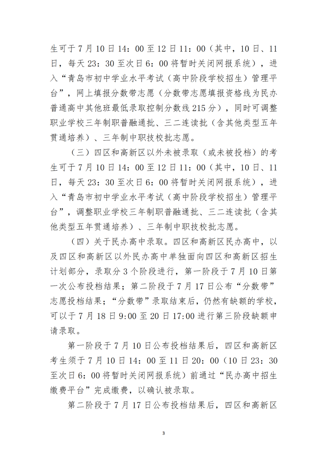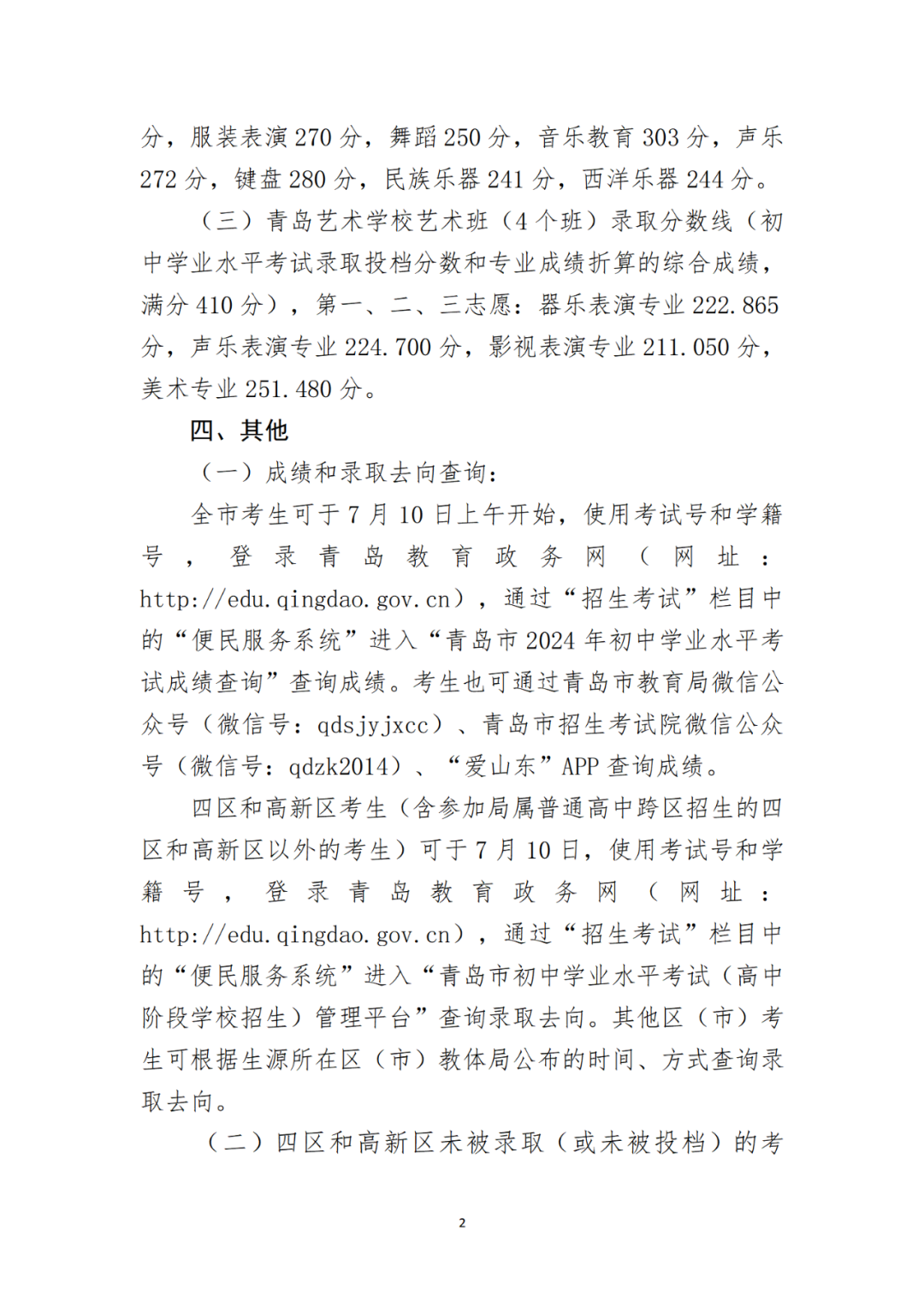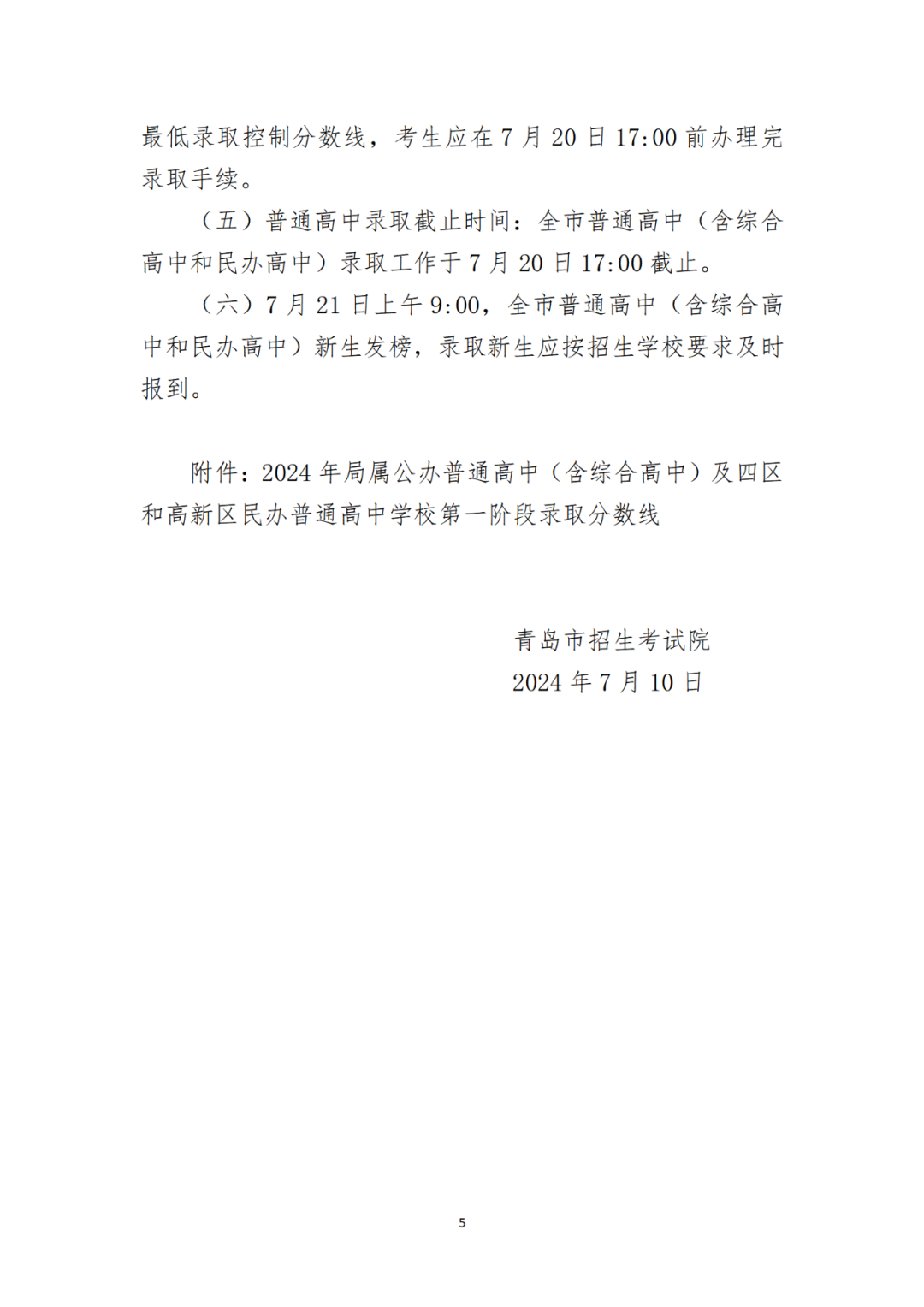 2024年青岛市局属公办普通高中及四区和高新区民办普通高中第一阶段招生录取分数线公告